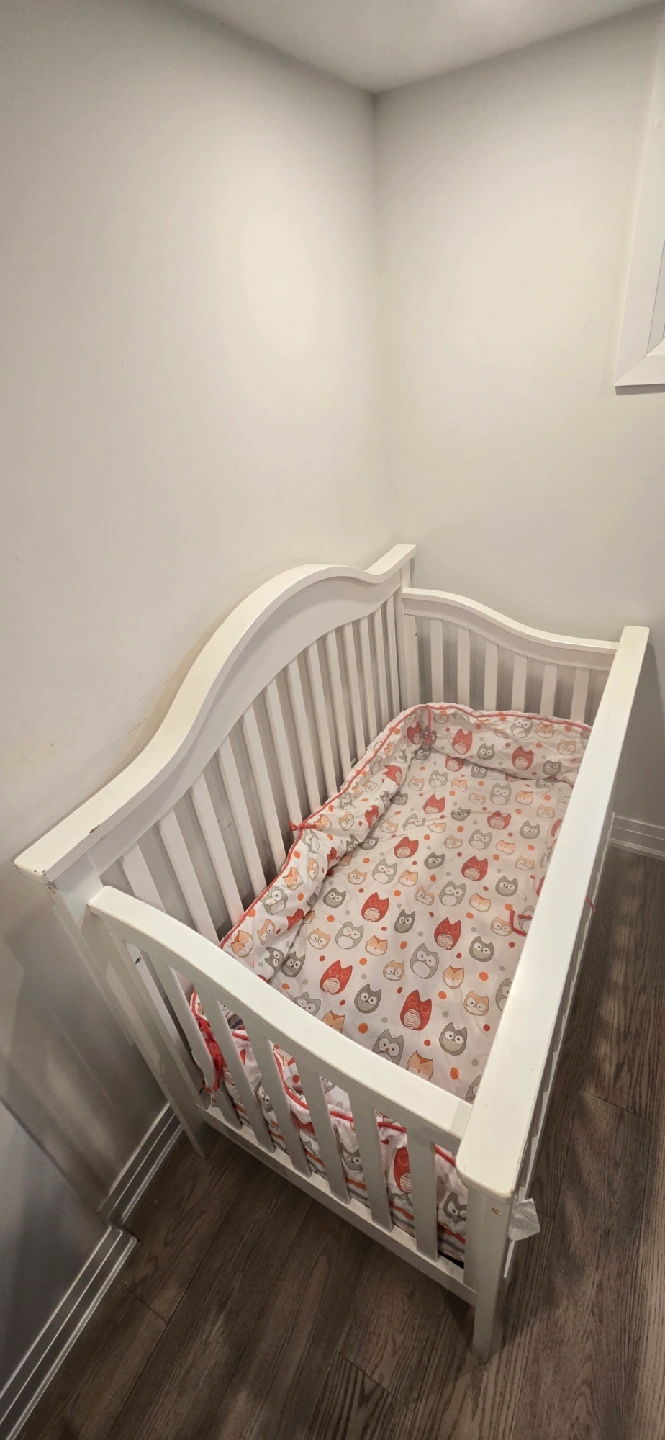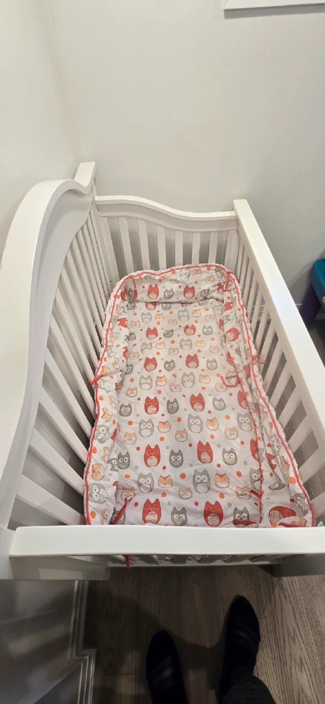 Selling a baby crib in great condition! It's white and comes with a cute owl-patterned mattress and bumper pad. Perfect for your little one's nursery