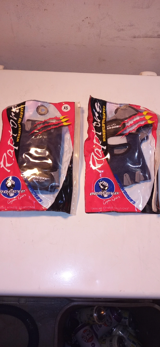 I'm selling pairs of ProGryp Raptors weightlifting gloves in sizes sm+ XS! They are still in the original packaging and are brand new. im an adult and I fit a small. In pics. Great for cycling too. I have 2 dozen pairs. $5. a pair or 3 pairs for $12. Great for x mas stocking stuffer or as a gift for the health nut. Features include: - Supreme double stitching for durability - Built-in terry cloth for comfort and ventilation - Padded double-layered thumb fingers for protection - Dual full adjustable wrist closures - Extremely lightweight
