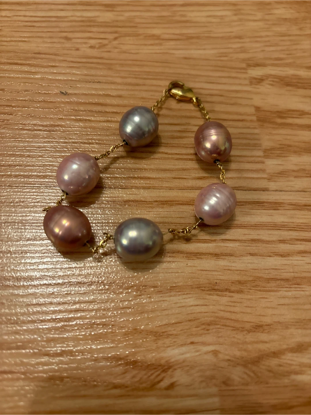 15Beautiful pearl necklace and bracelet set in excellent condition! The pearls have a lovely mix of colours including pink, grey, and bronze. The chain is gold coloured. Perfect for adding a touch of elegance to any outfit