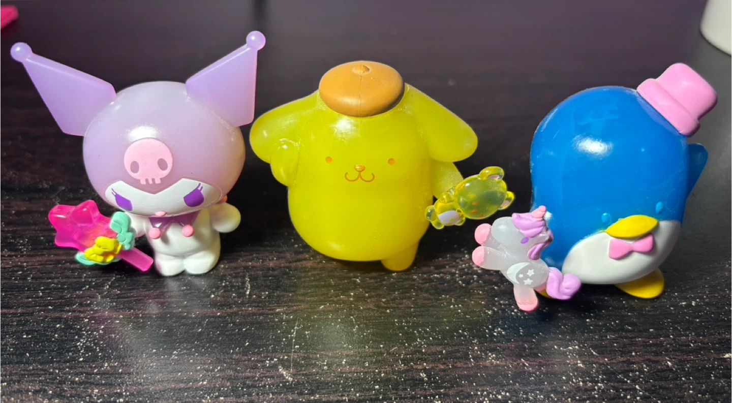 Selling a set of cute Sanrio character figures! Includes Kuromi, Tuxedo Sam, and Pom Pom Purin. They're in great condition and ready for a new home very good collectibles for any collector who is looking for a good fair price⭐️ —-> I only take cash no card pick ups only