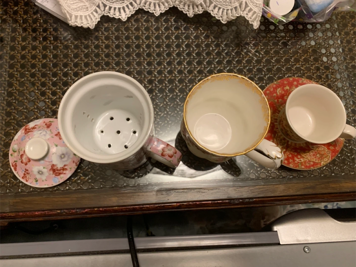 Selling a lovely floral tea/coffee cup. It includes a tall tea infuser mug with a lid, a small pitcher, and a teacup with a saucer. Perfect for a cozy tea time