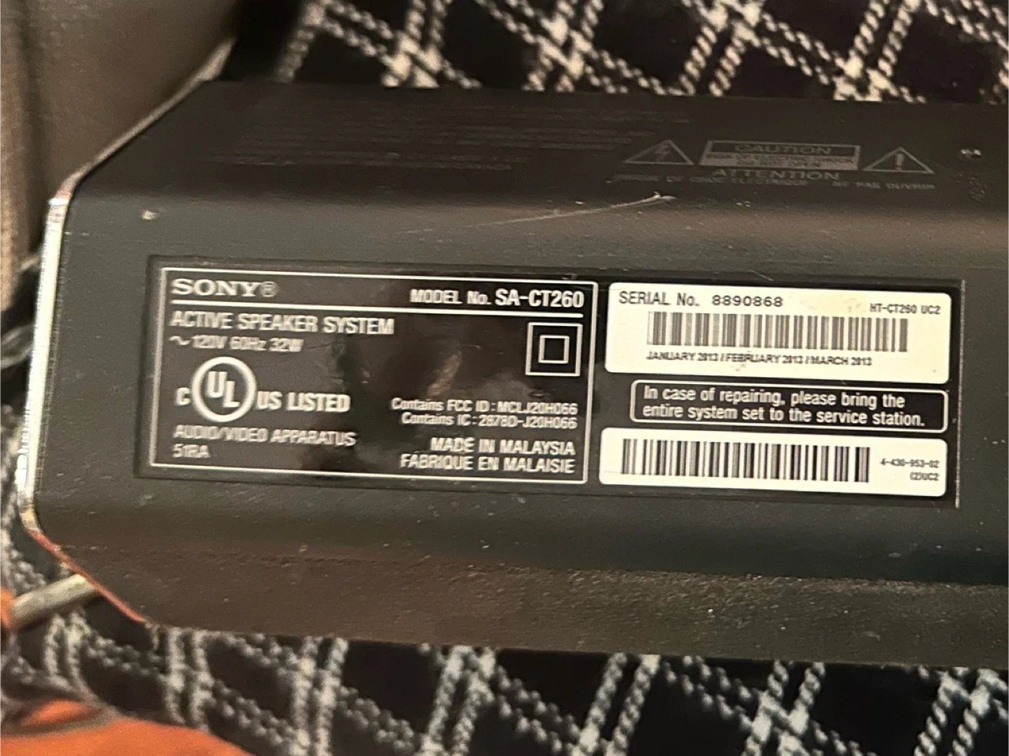 Selling a Sony active speaker system, model SA-CT260. It's an audio/video apparatus. Please bring the entire system to the service station in case of repairing