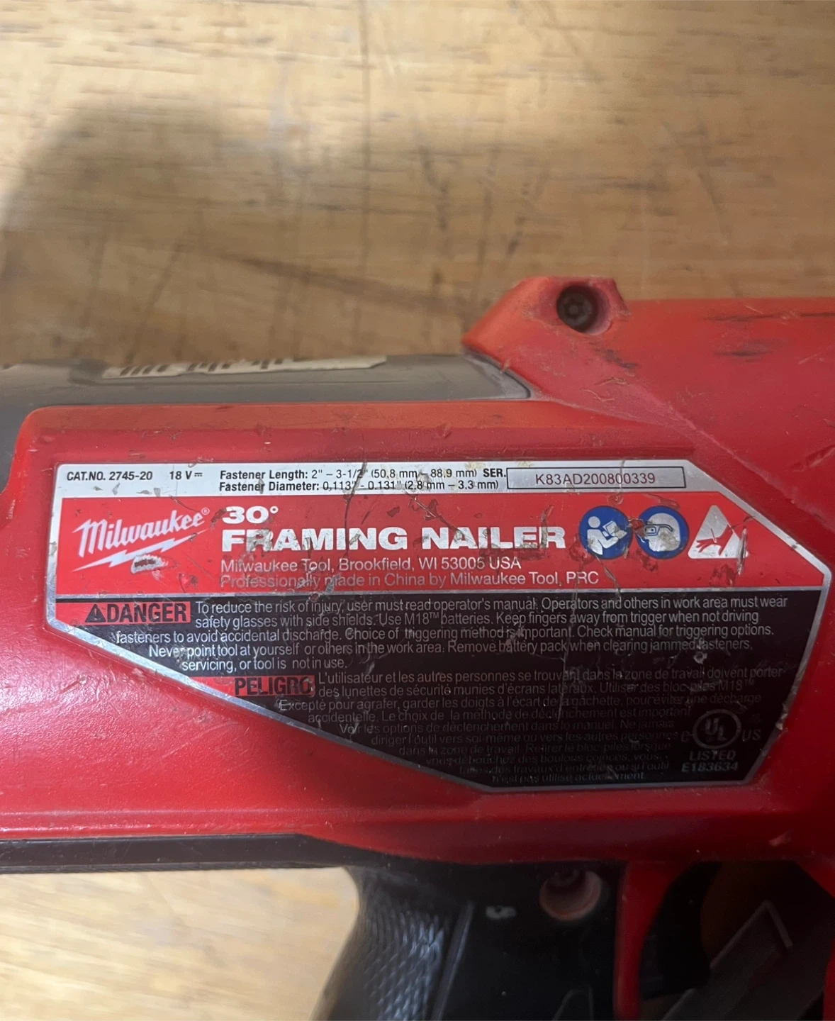 Selling a Milwaukee 30-degree framing nailer. It's in used condition, but ready for your next project! It uses M18 batteries.