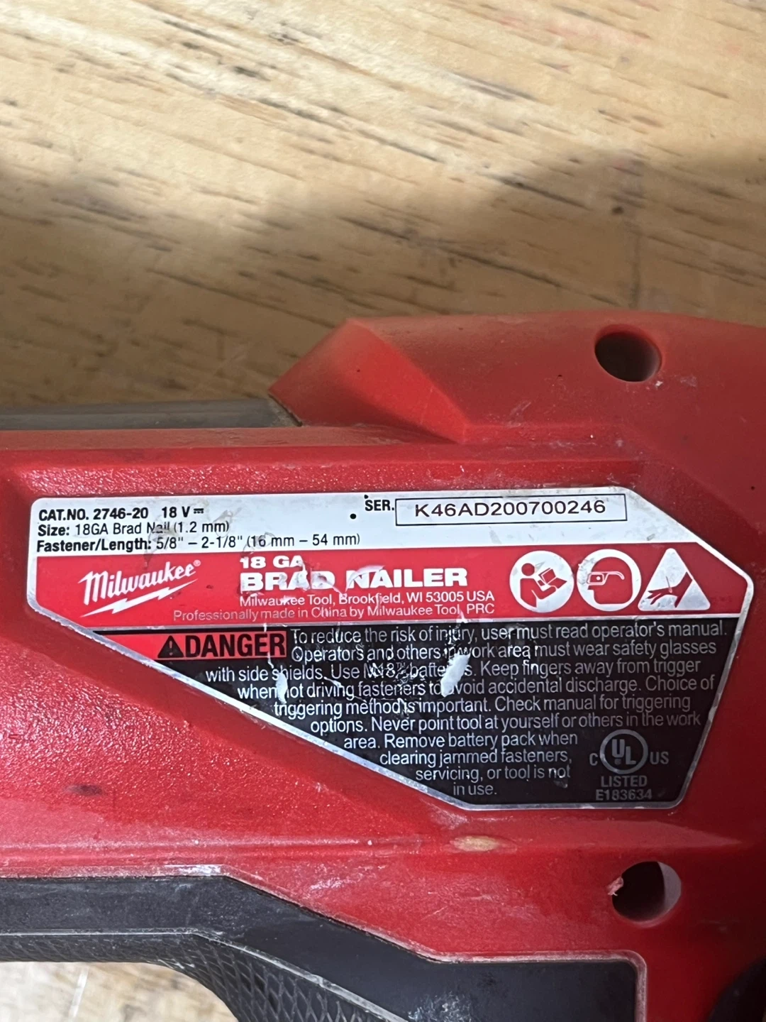 Selling a Milwaukee M18 FUEL 18GA Brad Nailer. It's in great condition and ready for your next project! It uses 18 gauge brad nails and is part of the M18 FUEL series.