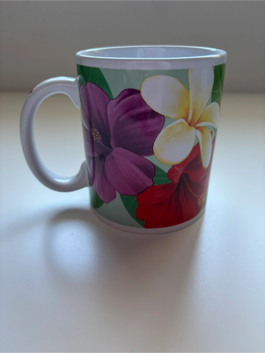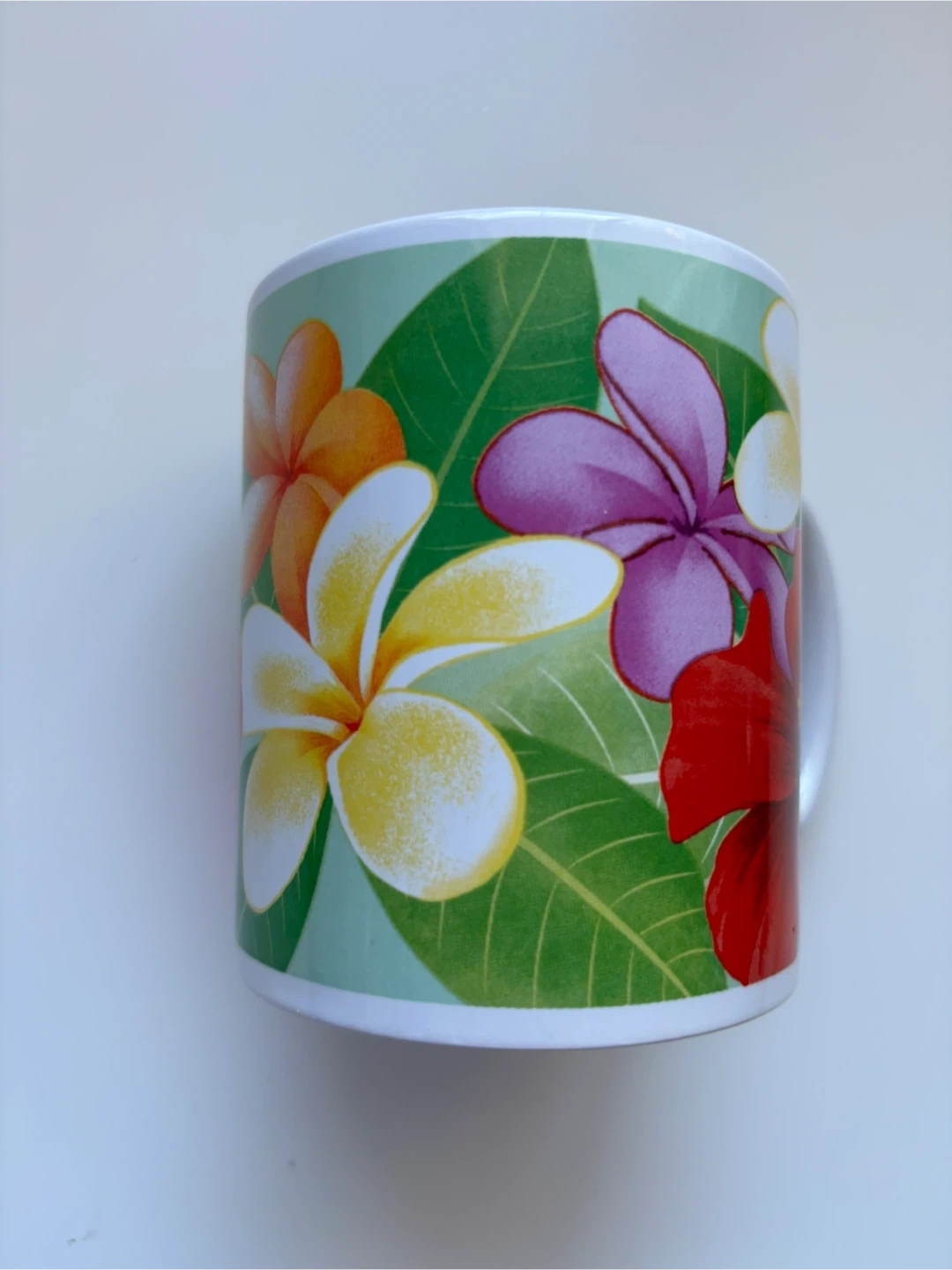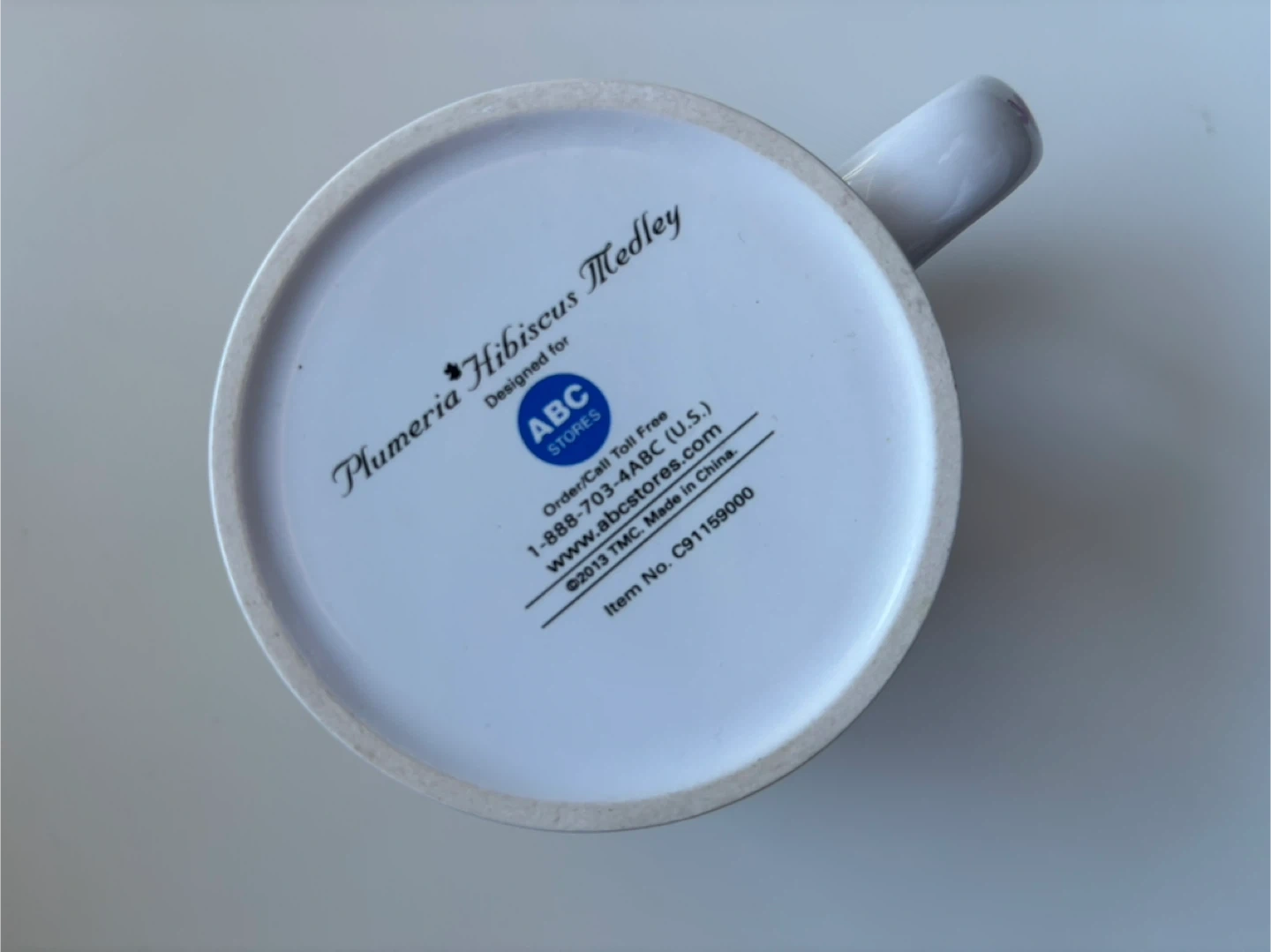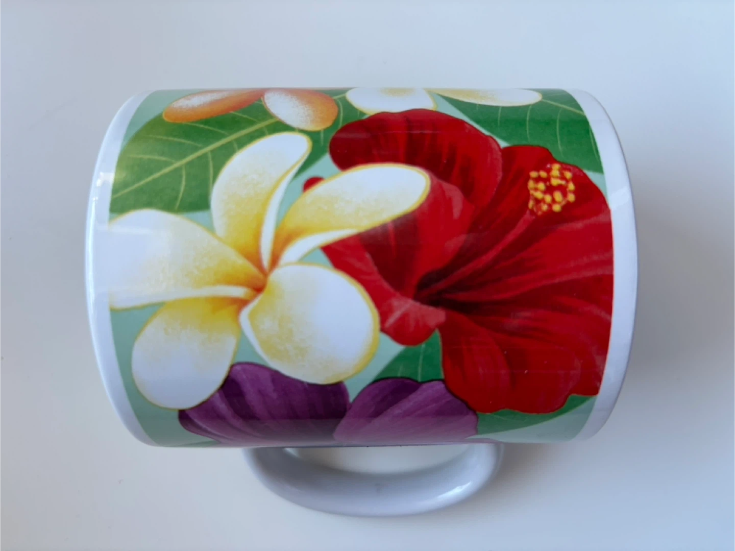 Here's a lovely mug from ABC Stores, featuring a beautiful Plumeria Hibiscus Medley design! It's in great shape and ready to brighten up your morning coffee or tea
