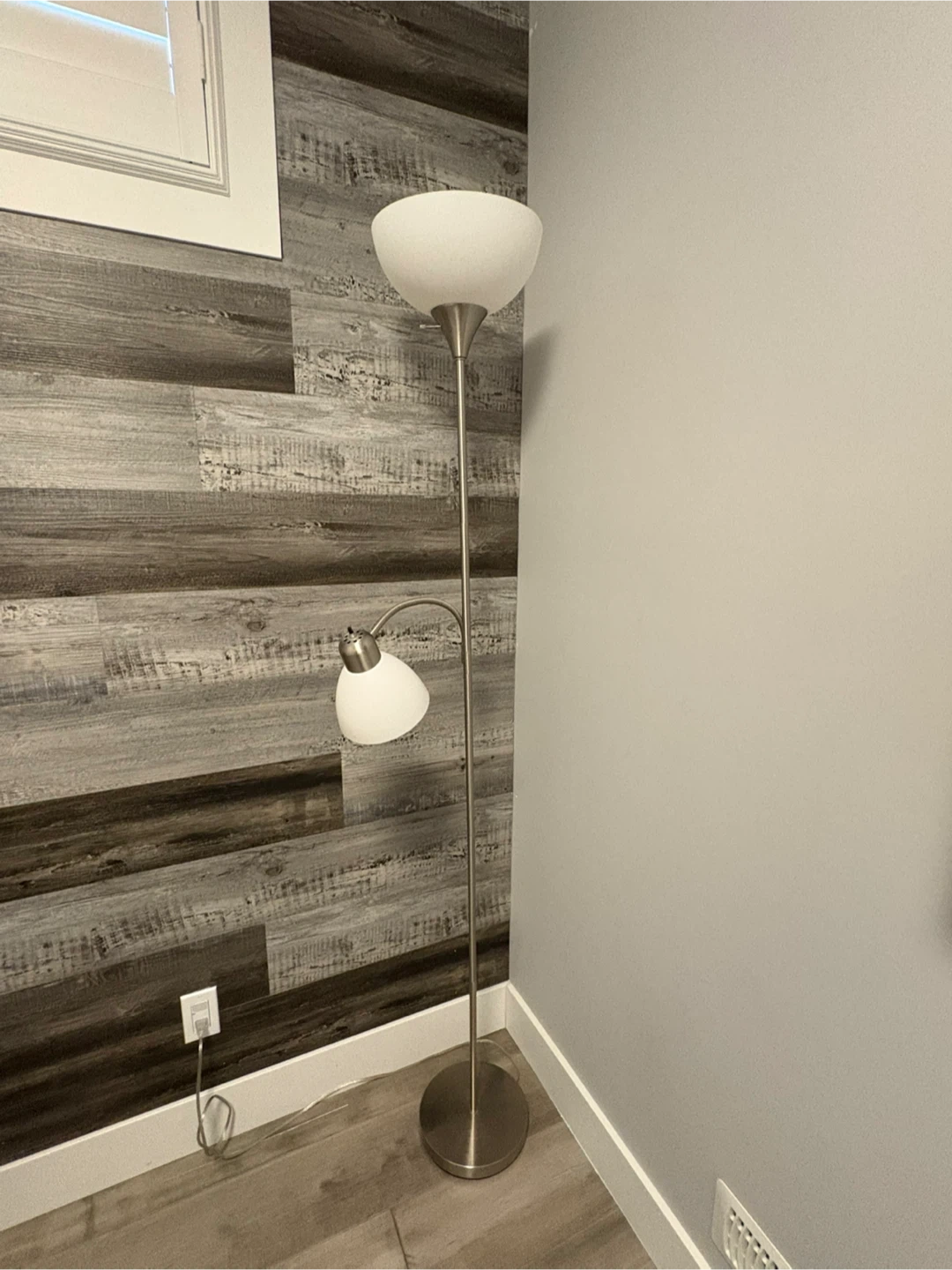 Selling a modern torchiere floor lamp in great condition! It features a sleek design with a large upward-facing shade and a smaller adjustable reading light. Perfect for adding ambient lighting to any room