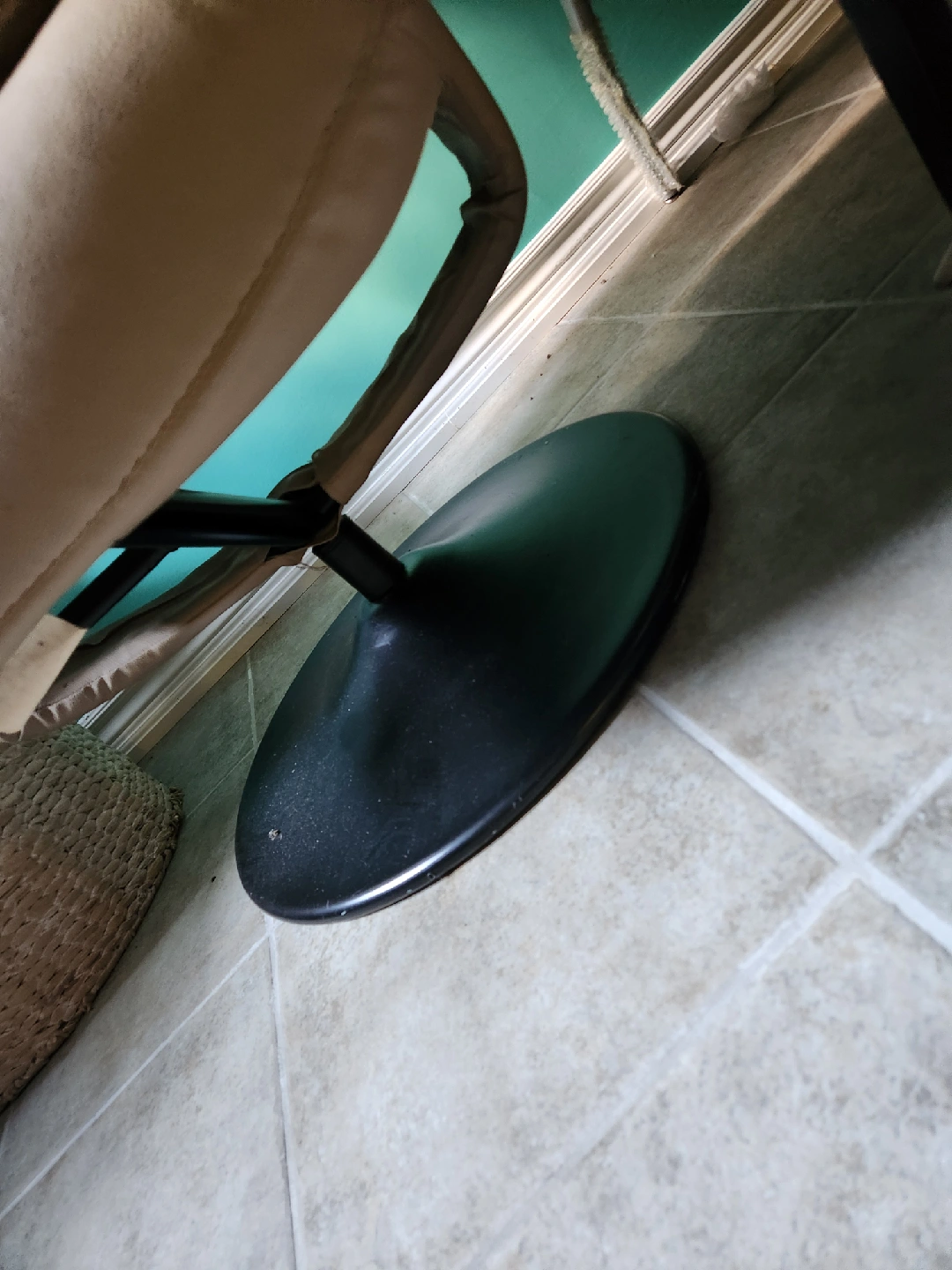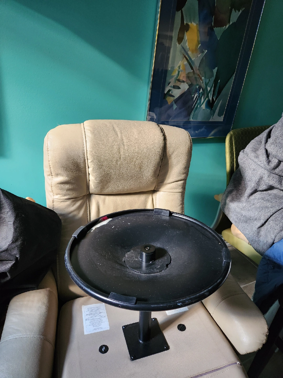 Selling a gently used swivel chair that comes with an adjustable table. It's perfect for relaxing and having a convenient surface for your snacks or books. The chair has a comfortable design and the table is easily adjustable to your preferred height. A great addition to any living room or personal space!