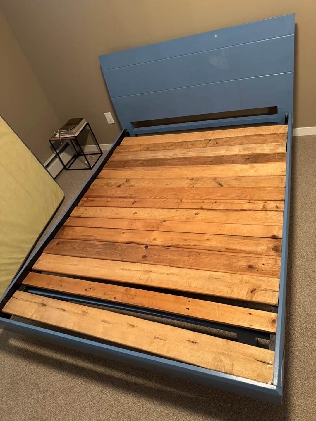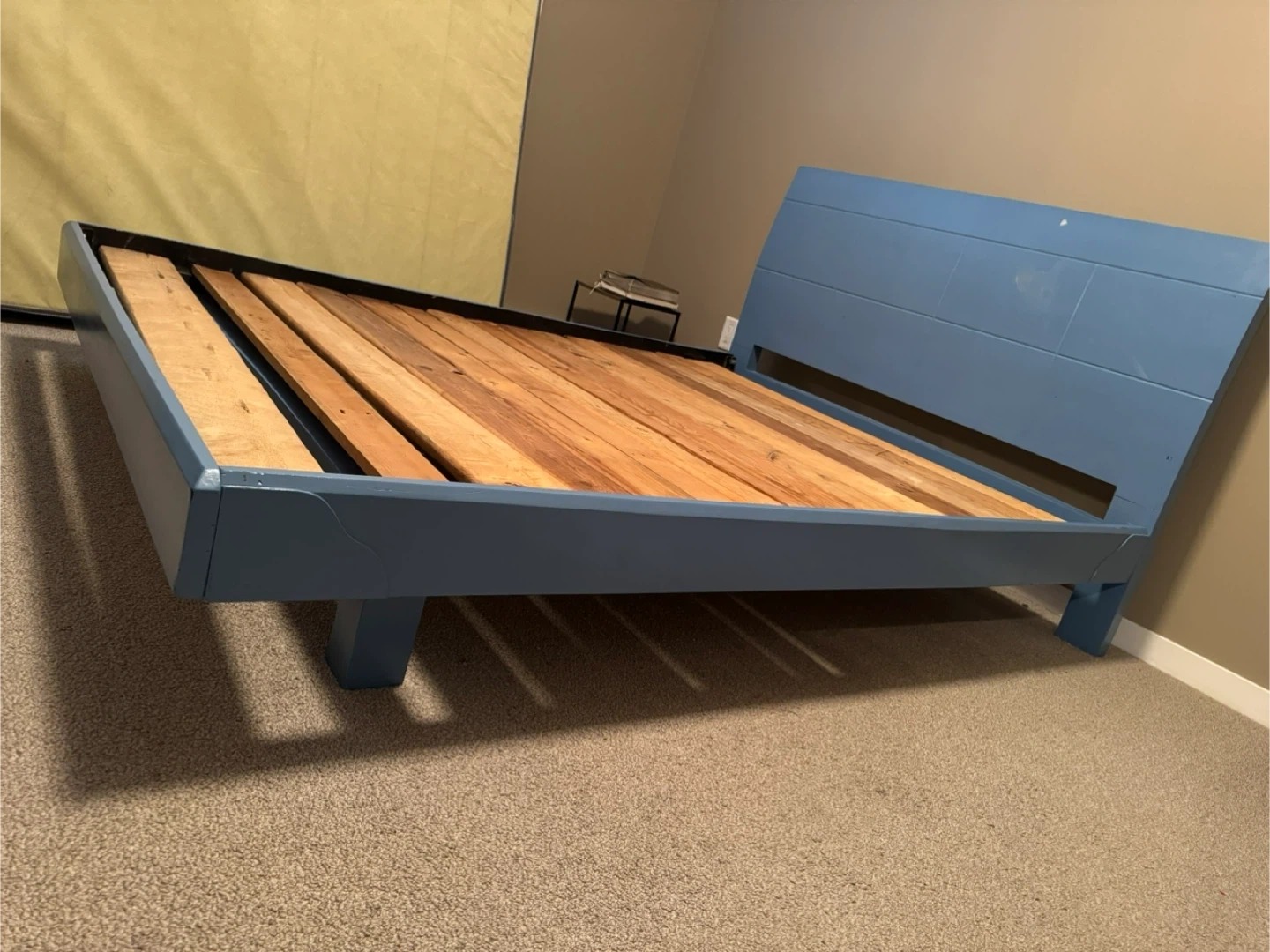 Selling a sturdy wooden bed frame in a nice blue colour. It's in good condition and ready for a new home! Perfect for adding a pop of colour to your bedroom