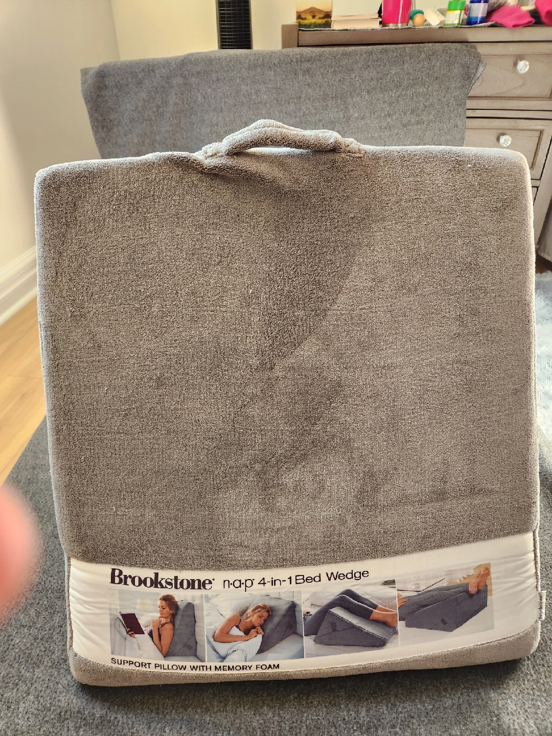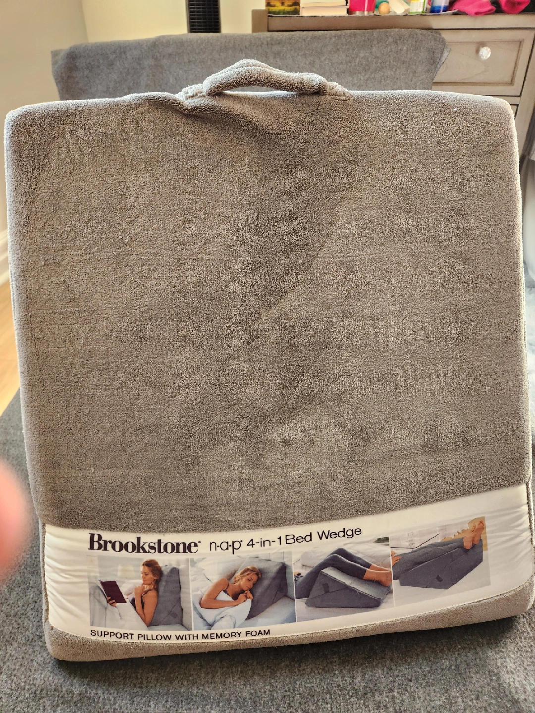 Selling a Brookstone n-a-p 4-in-1 bed wedge pillow. It's a support pillow with memory foam. This wedge can be used in multiple configurations for reading, sleeping, or relaxing. It's in great condition and ready for a new home!