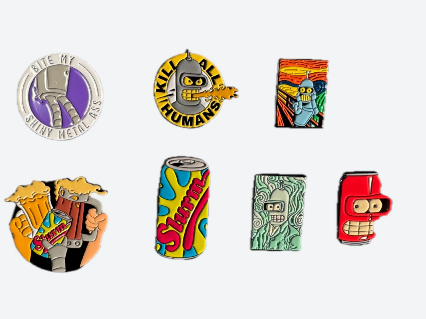 These pins feature various characters and iconic imagery from the show, including Bender, Slurm, and more.