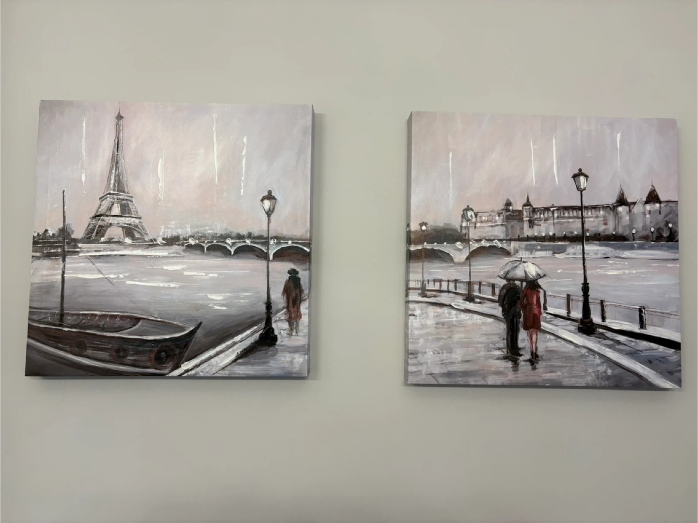 Selling a set of two canvas wall art pieces featuring a lovely Paris cityscape. These pieces would add a touch of Parisian charm to any room! They depict classic scenes of Paris, including the Eiffel Tower and other iconic landmarks. Perfect for adding a bit of art to your space