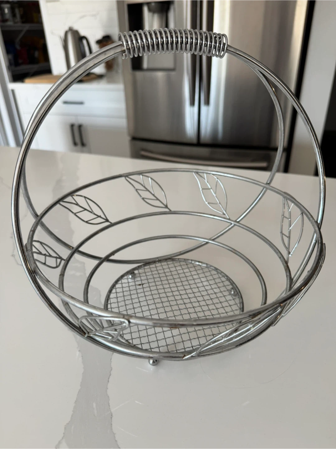 Selling a lovely silver metal fruit basket! It features a cute leaf design around the rim and a sturdy handle with a coiled grip. Perfect for adding a touch of elegance to your kitchen counter or dining table