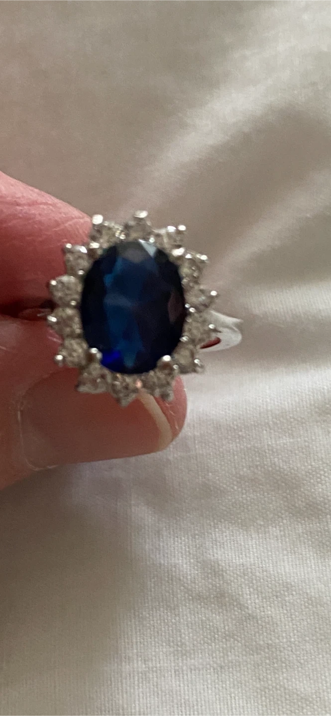 Selling a beautiful white gold ring featuring a striking blue stone. The ring has a classic design with small clear sapphire stones surrounding the centre stone. It's in great condition and ready to add a touch of elegance to any outfit! 10k white gold.
