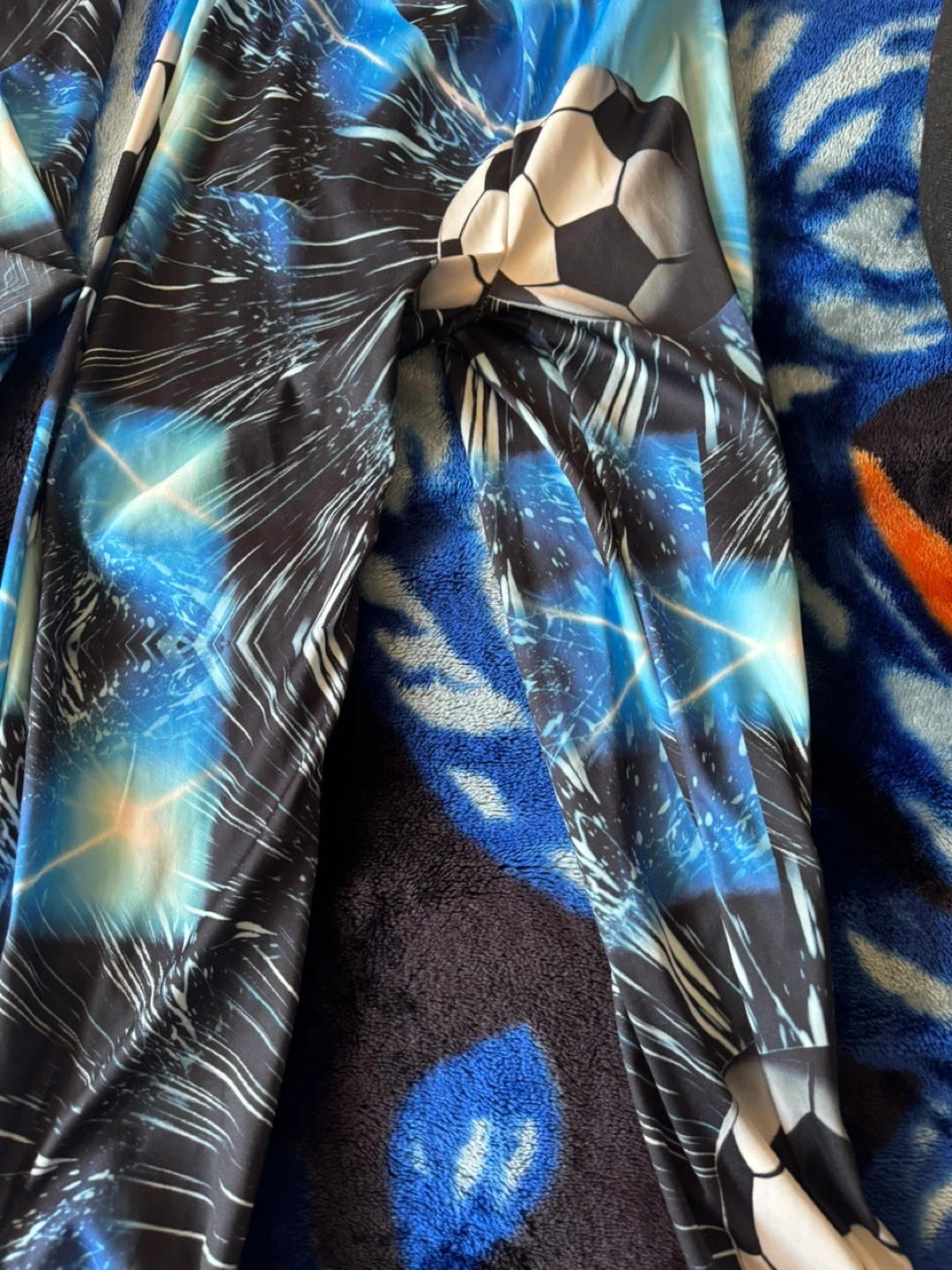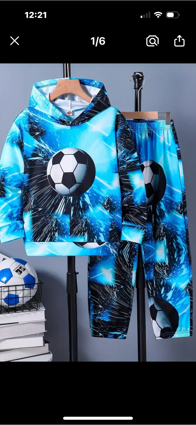 Selling a fun blue soccer-themed tracksuit for kids! The set includes a hoodie and matching pants, both in size 150. It has a vibrant blue and black design with soccer ball accents. Perfect for your little athlete!