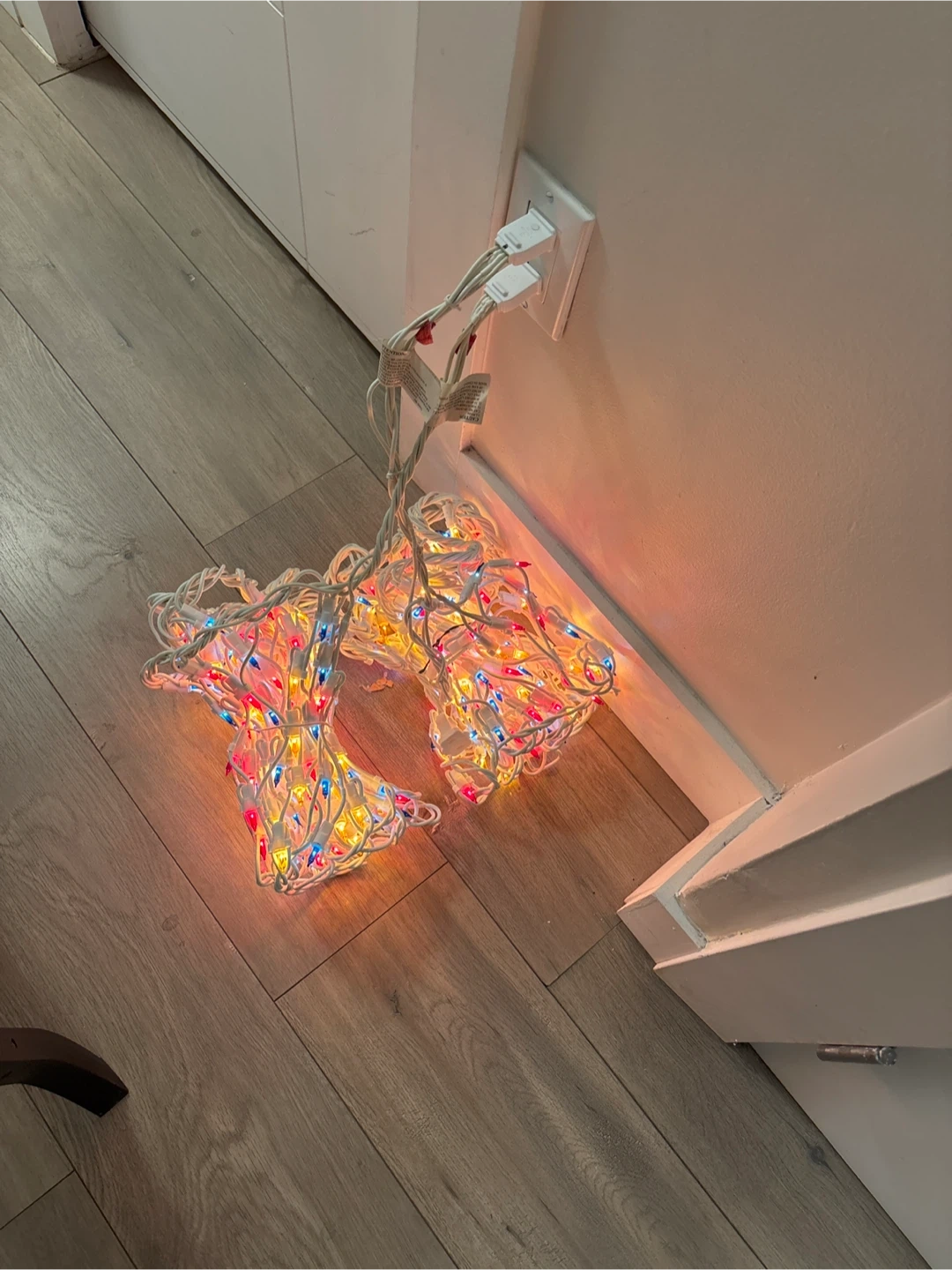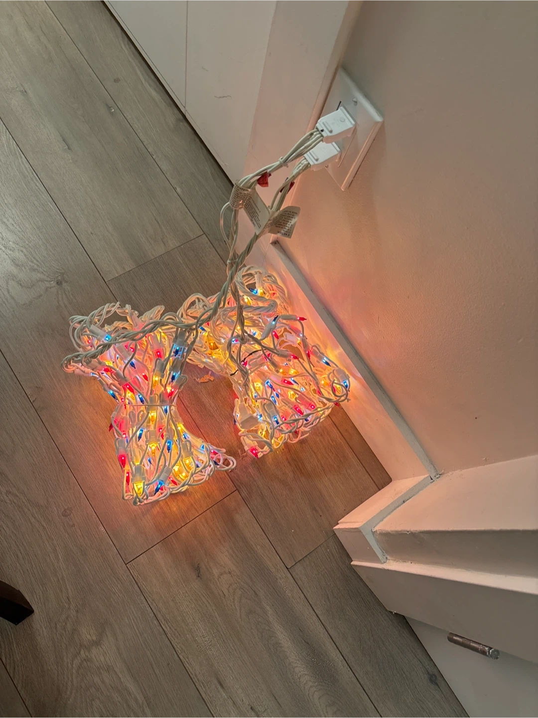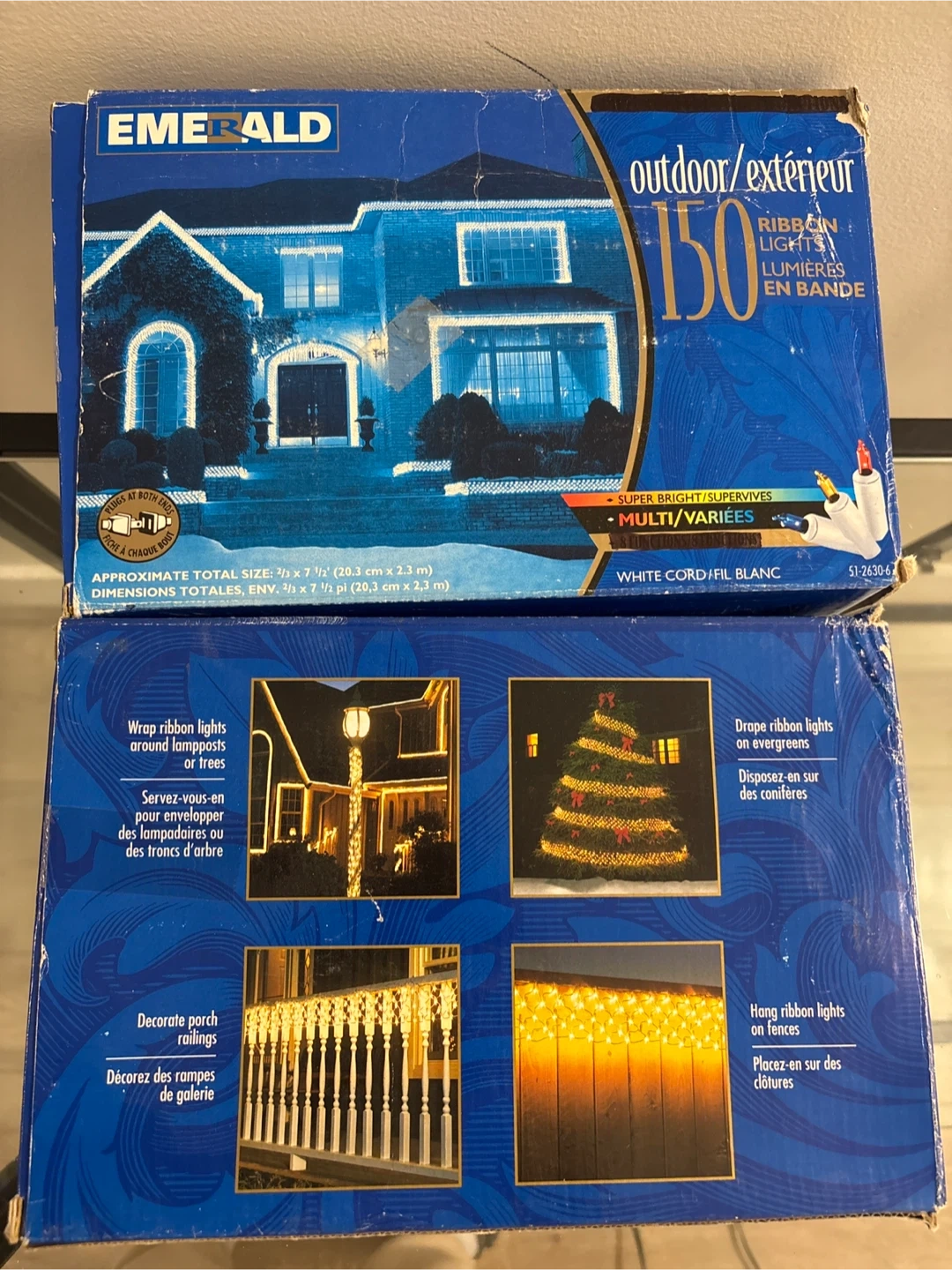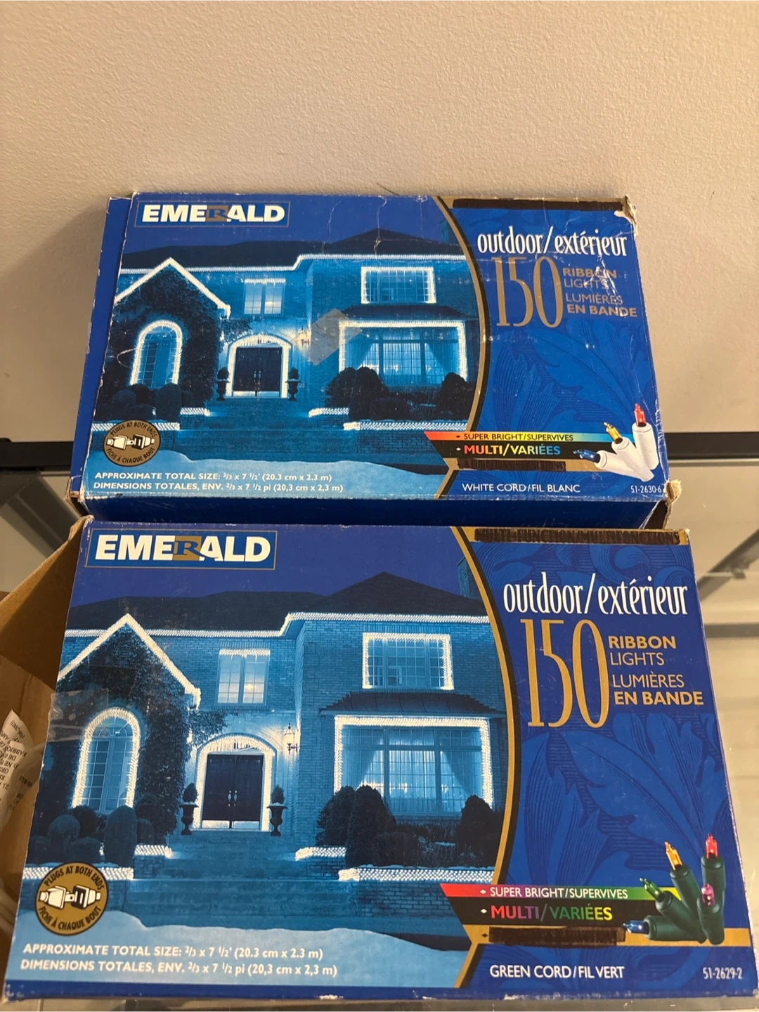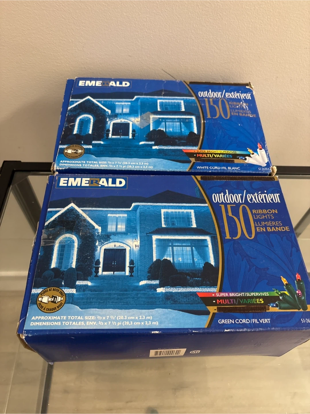 Get ready to decorate with these Emerald outdoor ribbon lights! They come with 150 lights and are perfect for wrapping around lampposts, trees, porch railings, and more. The approximate total size is 2/3 x 7 1/2' (20.3 cm x 2.3 m). I have two pack Each for $15 Both for $25