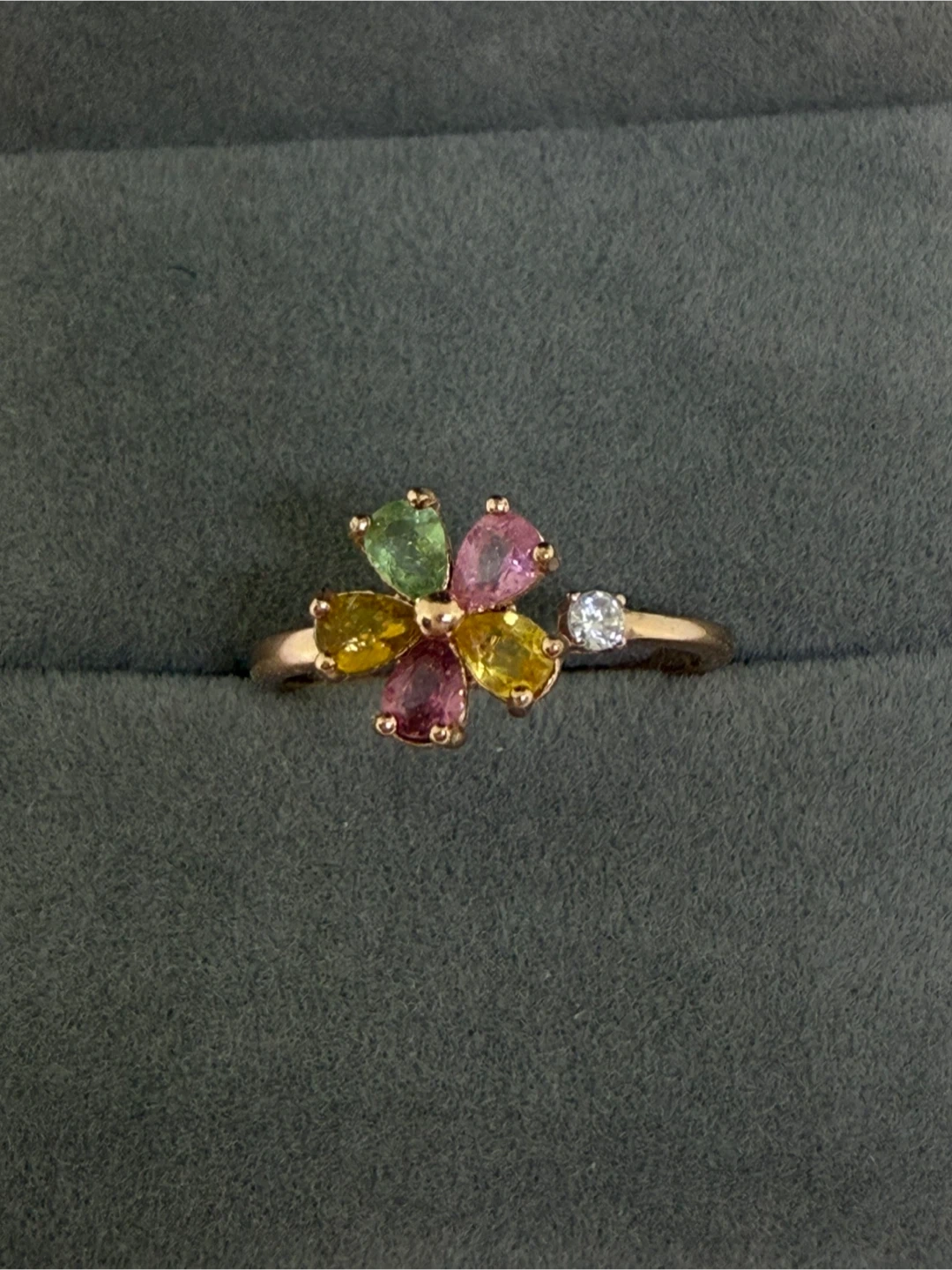 Selling a beautiful S925 silver colourful tourmaline ring! It features a lovely flower design with pink, yellow and green gemstones. The ring weighs 2.02g. The special point is that the flower part can spin. It is so cool and cute. The design is open mouth so it can fix US size 6 to 8.