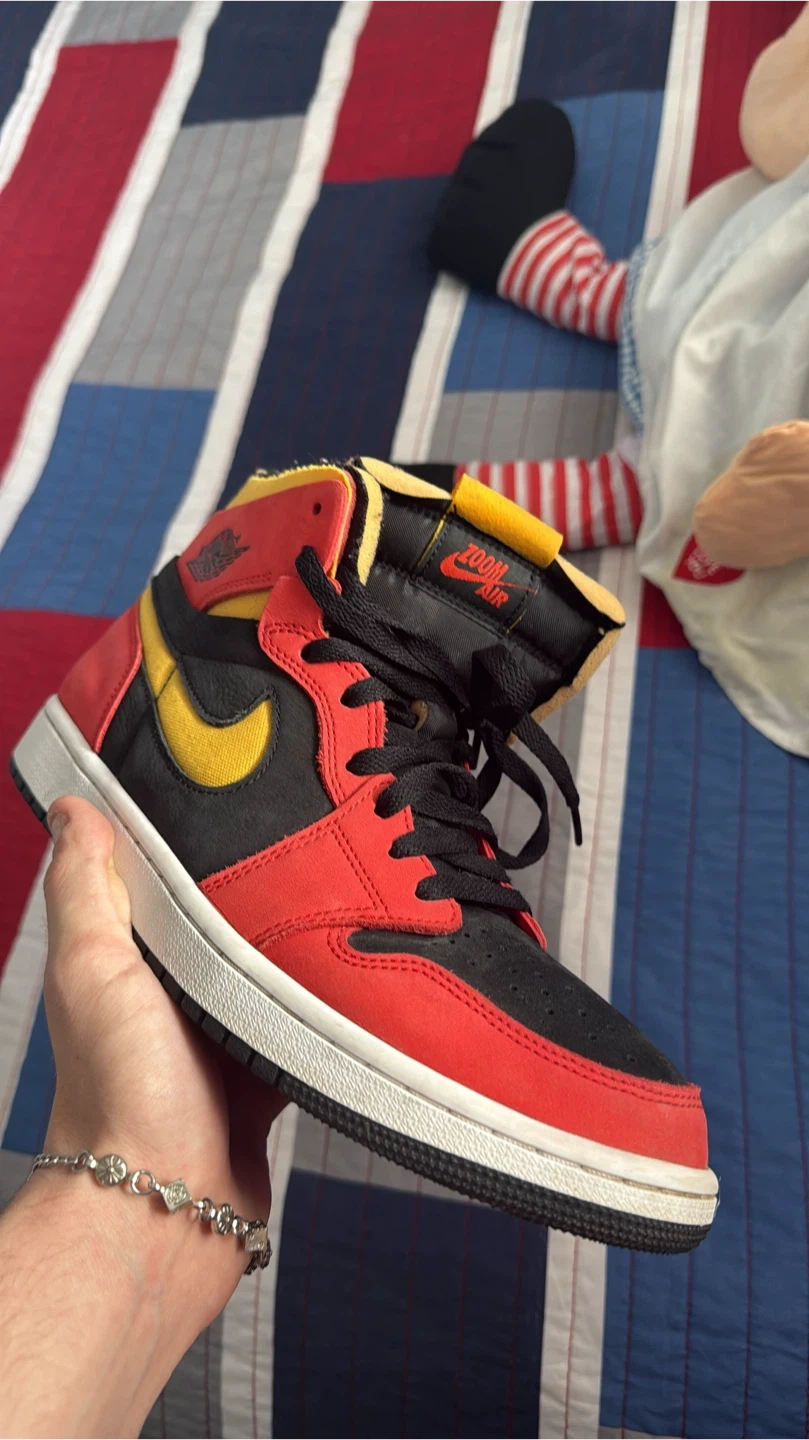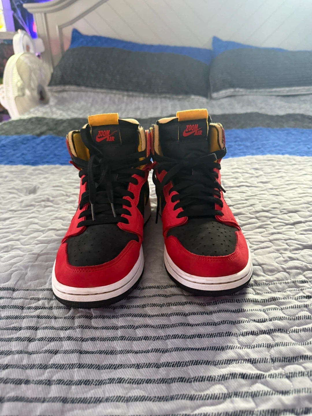 Selling a pair of Air Jordan 1 Zoom Air CMFT sneakers! These are in a red, black, and yellow colourway. They are in great condition and ready for a new home