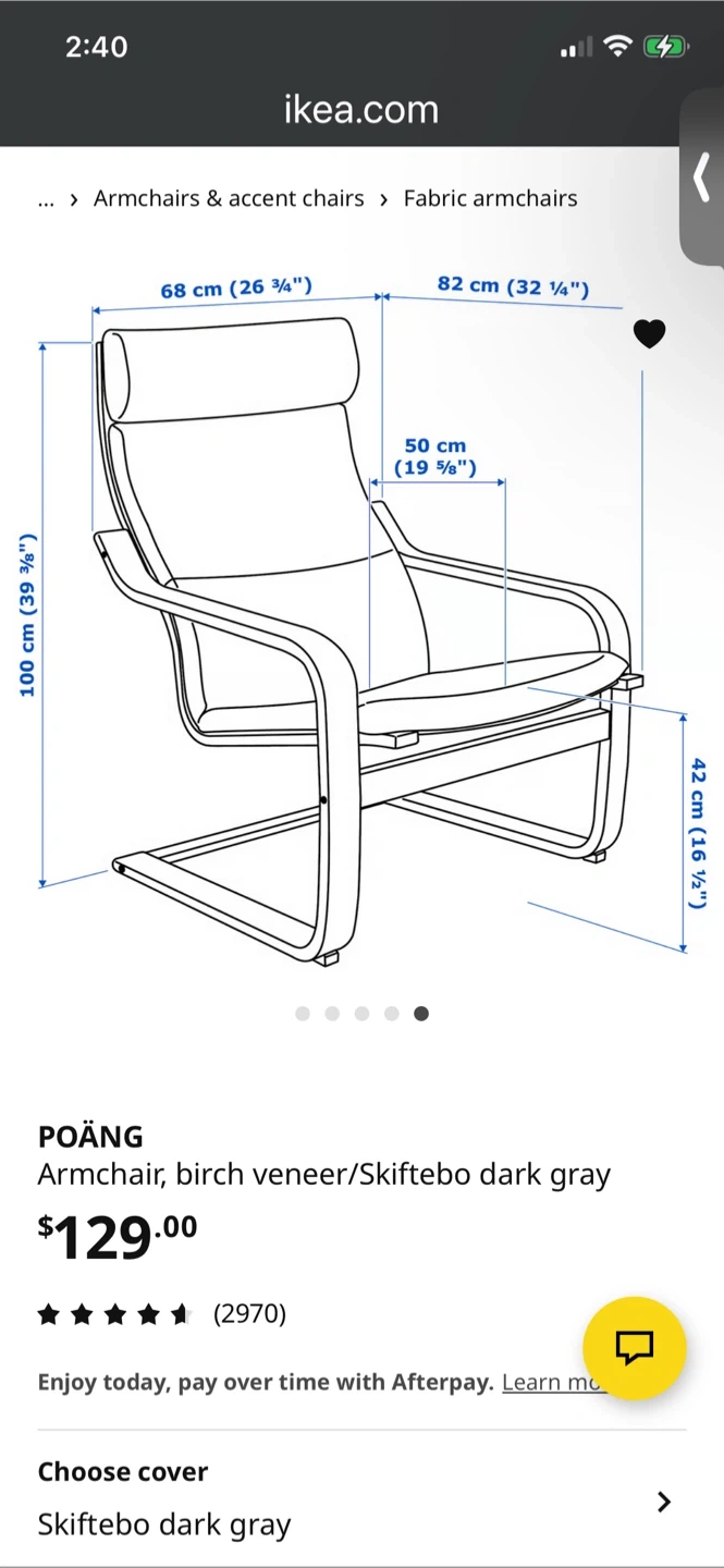 Selling a comfy IKEA POÄNG armchair in birch veneer with a Skiftebo dark gray cushion! It's in great shape and ready for a new home. Dimensions: - Width: 68 cm (26 ¾") - Depth: 82 cm (32 ¼") - Height: 100 cm (39 ⅜") - Seat width: 50 cm (19 ⅝") - Seat height: 42 cm (16 ½")