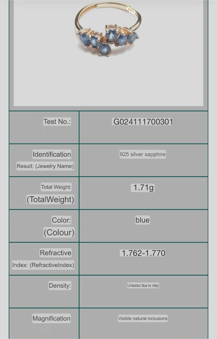 Selling a beautiful S925 silver sapphire ring in blue. The gemstones have great transparency. It weighs 1.71g. It has visible natural inclusions and comes in a box. The ring size is adjustable and it is suitable for US size 6 to 8.