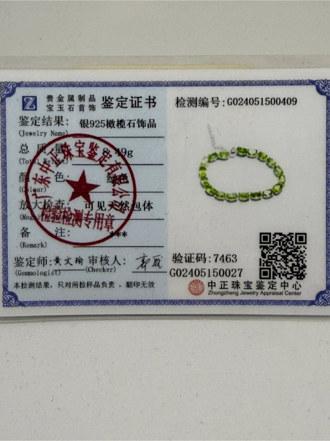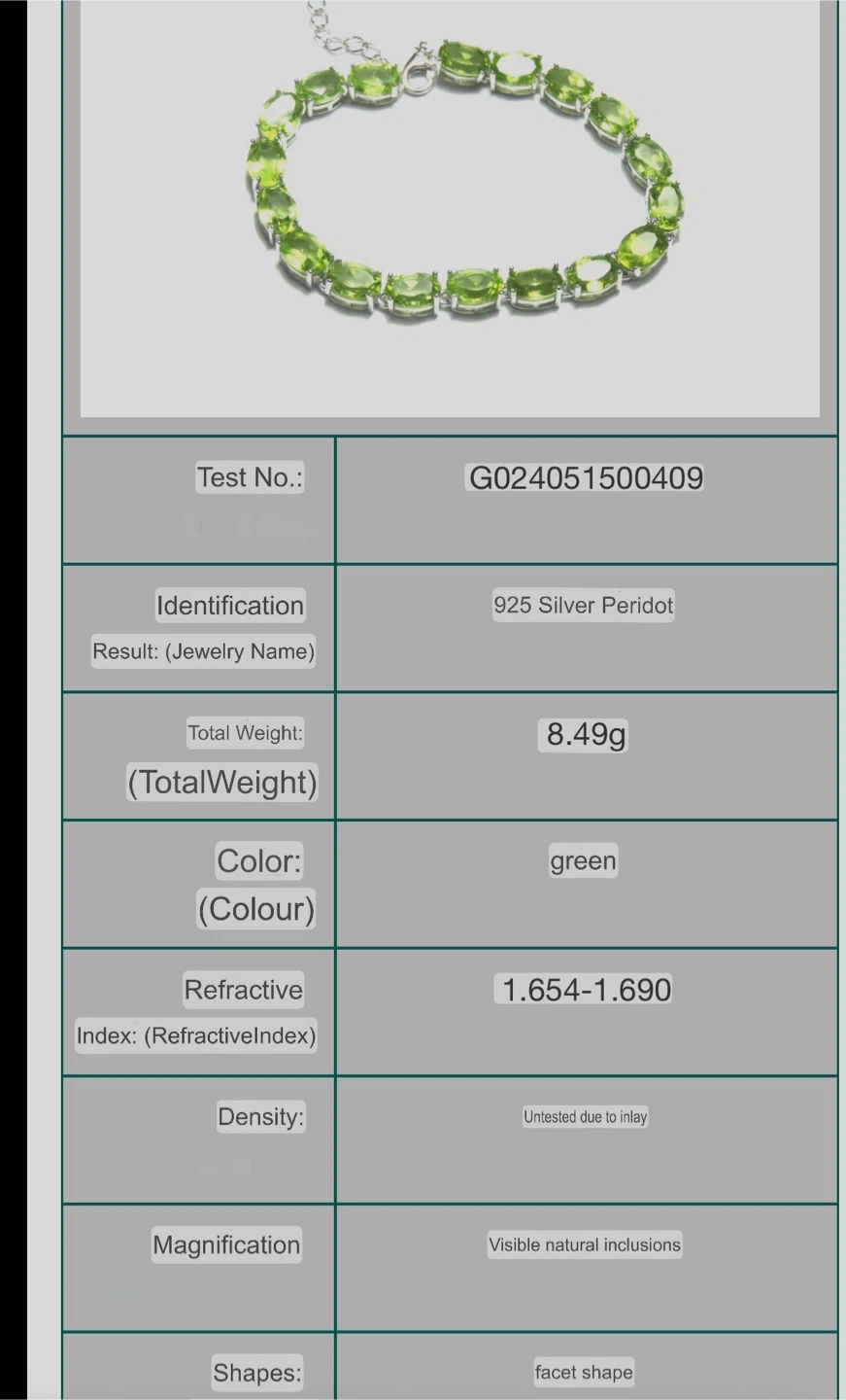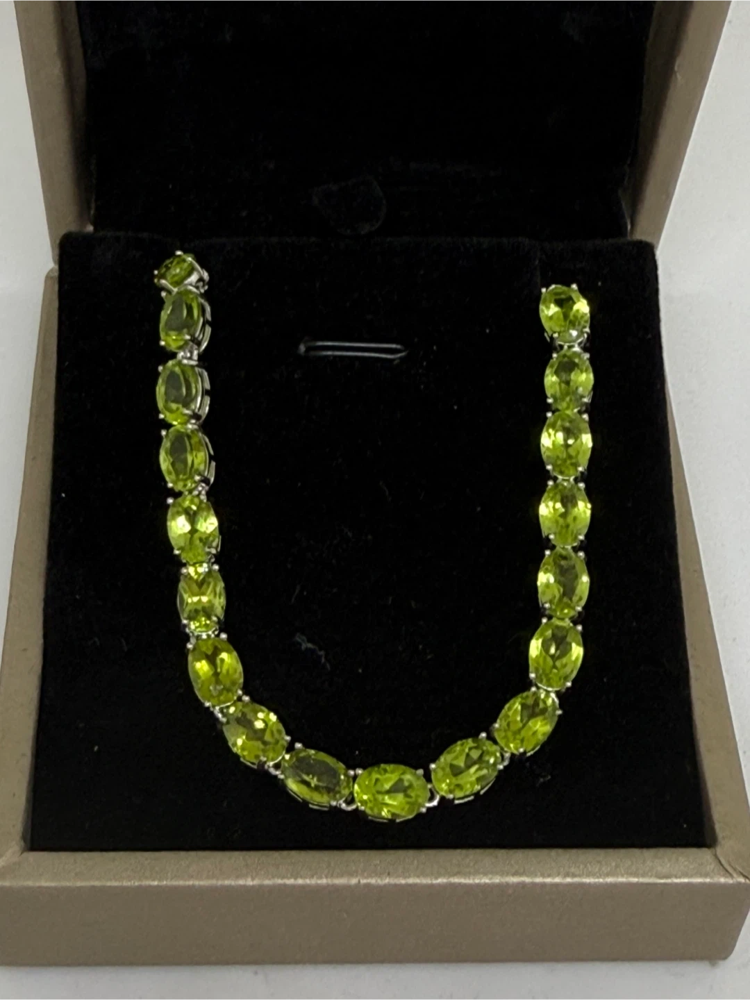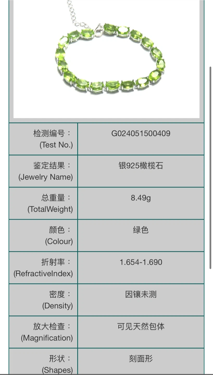 This is a lovely S925 silver bracelet featuring natural peridot gemstones. The bracelet weighs 8.49g and has a beautiful green colour. The length is 15 cm with 5 cm extension.