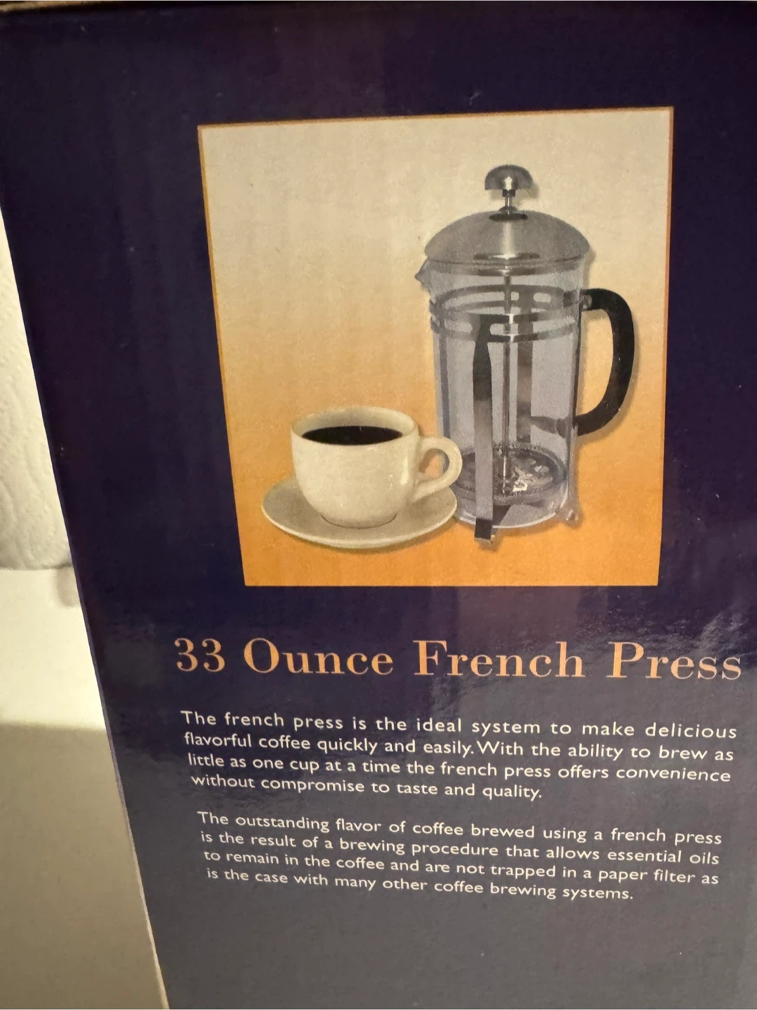 This French press is the ideal system to make delicious flavorful coffee quickly and easily. With the ability to brew as little as one cup at a time, the French press offers convenience without compromise to taste and quality. It features heat-resistant shatterproof borosilicate glass and a mirror-polish finish stainless steel frame. It also has a cool-touch handle and a high-quality plastic knob.