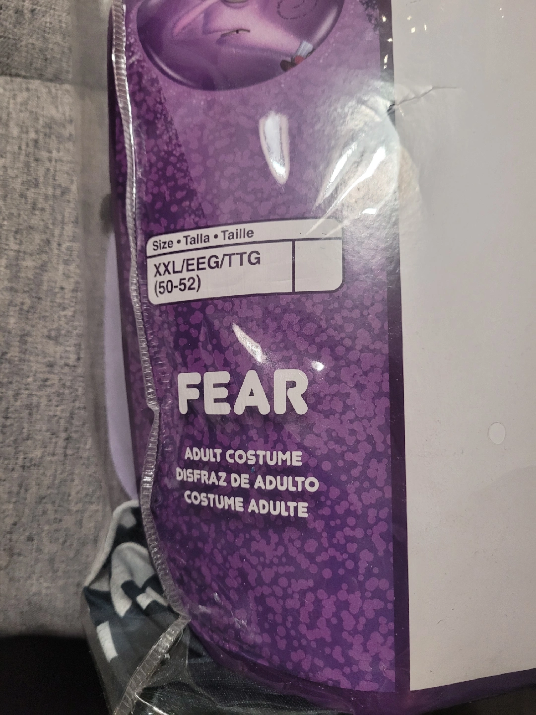 Only worn once and still with packaging Disney Pixar Inside Out 2 Fear adult costume! This costume is a size XXL (50-52). Perfect for Halloween or any costume party!