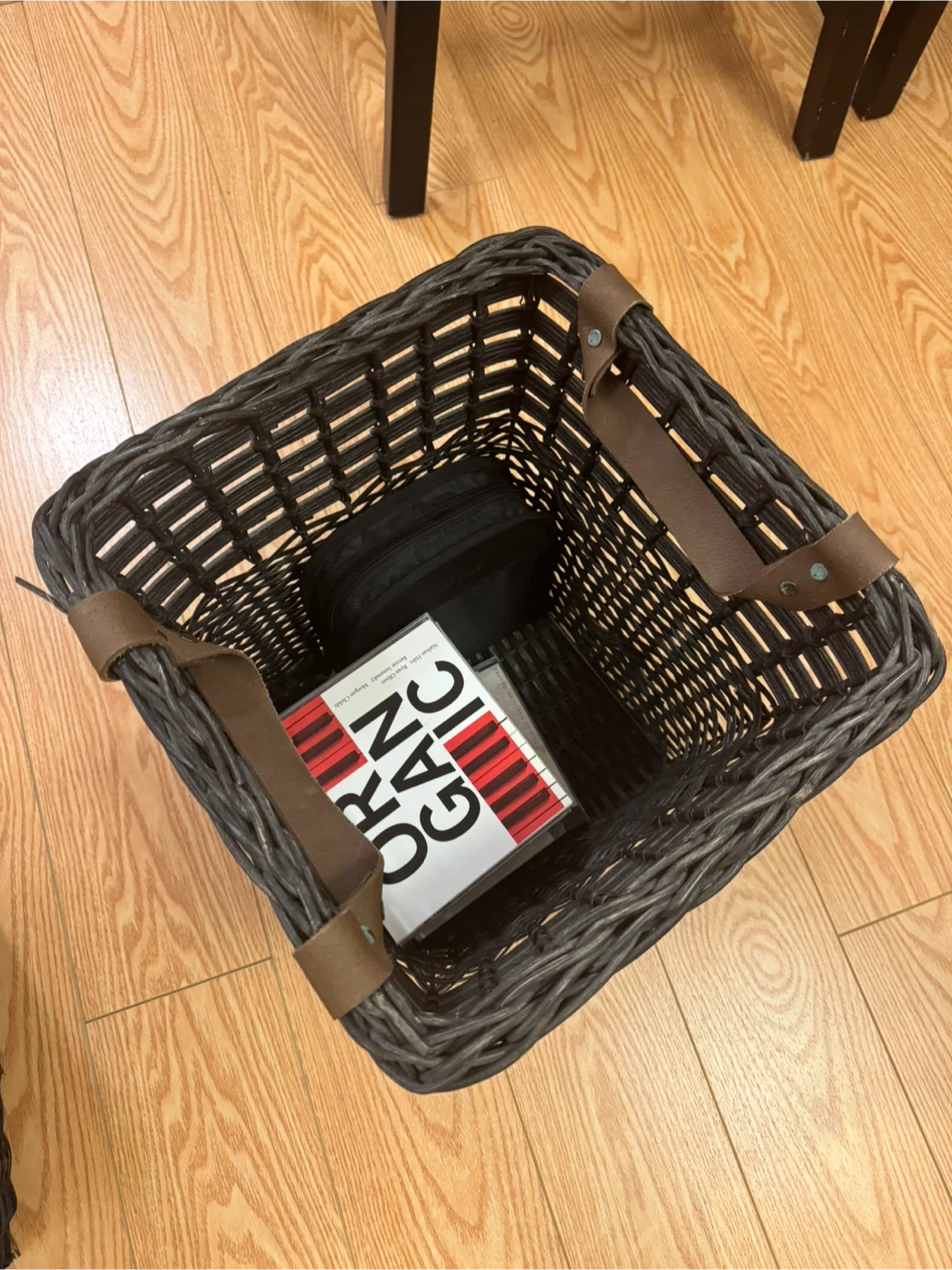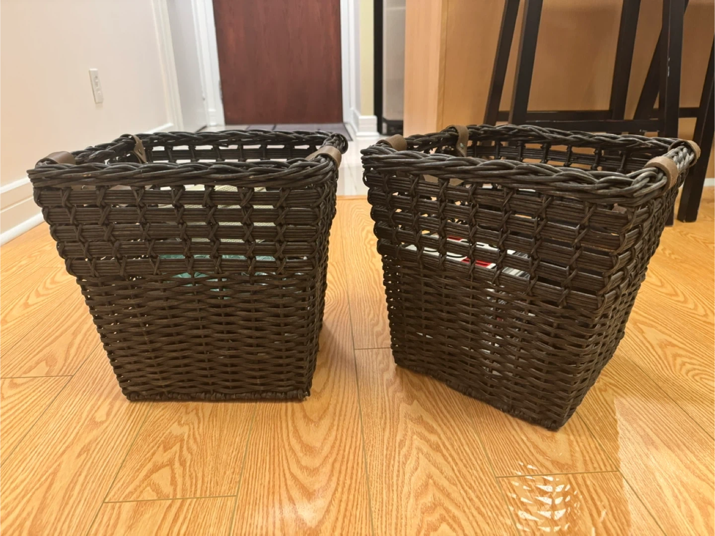 Two wicker storage baskets, perfect for organizing your home! They're a dark brown colour with leather-look accents, adding a touch of style to any room. Great for storing books, blankets, or anything else you need to keep tidy