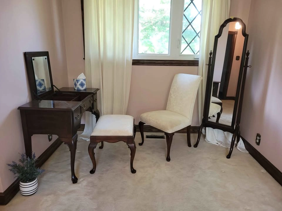 Beautiful vintage full-length cheval mirror in solid wood with a rich dark finish. The mirror tilts and locks securely in place with brass ring hardware. Lovely turned finials and curved legs add timeless charm — perfect for a bedroom, dressing area, or staging setup.