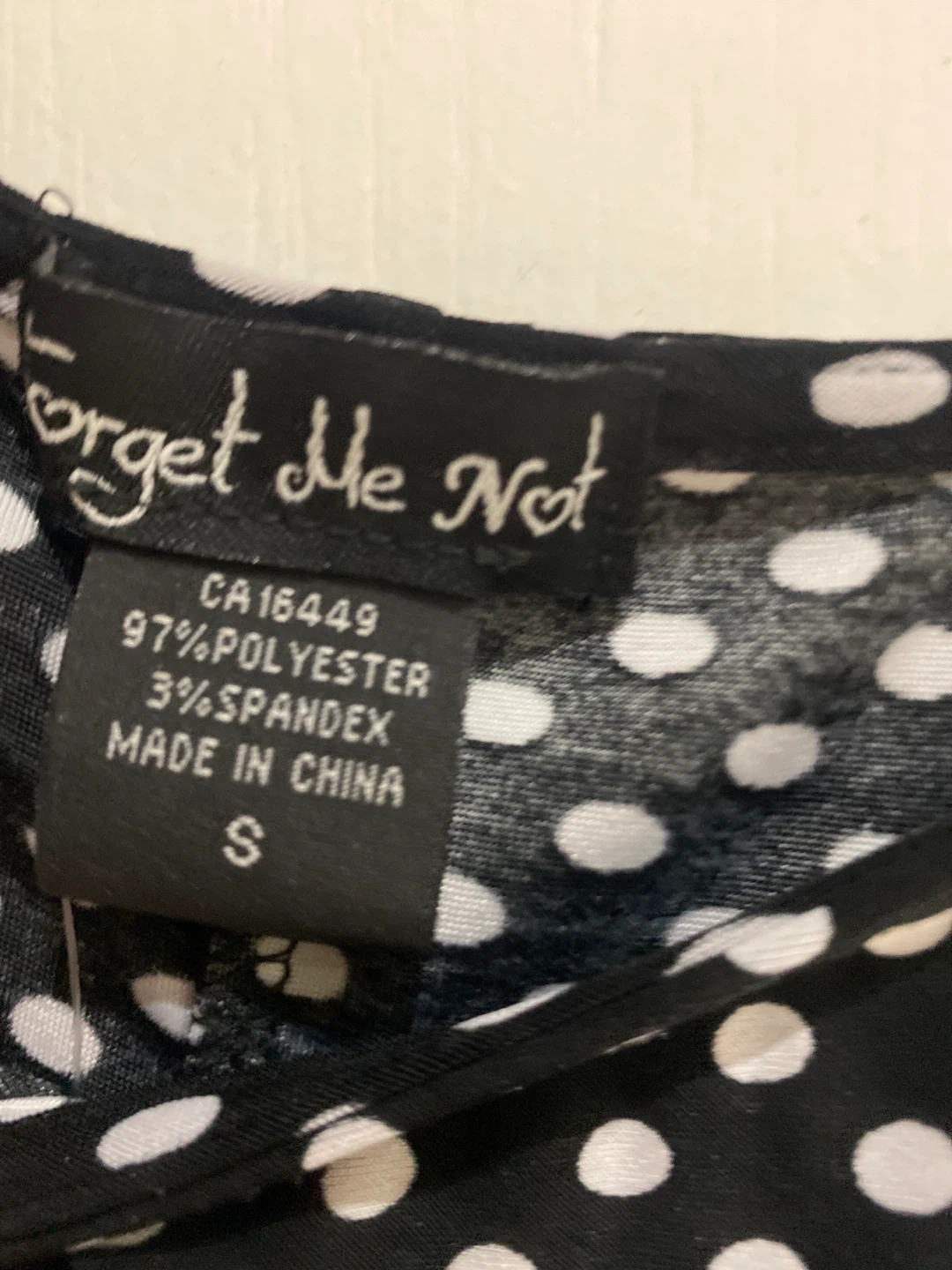 Cute Forget Me Not dress with a polka dot pattern! It's a size small and made of 97% polyester and 3% spandex, so it's nice and stretchy