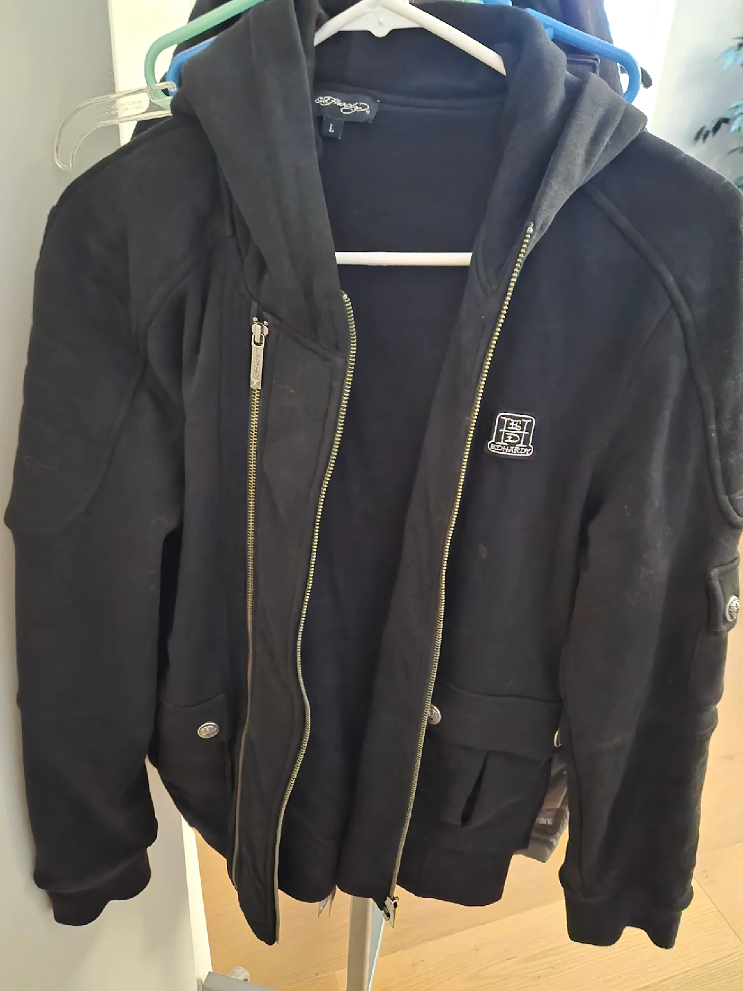 53Selling a black Ed Hardy hoodie in size L. It features a unique design on the back with wings and tigers. The front has a zipper and a logo patch. It's in great condition and ready for a new home!