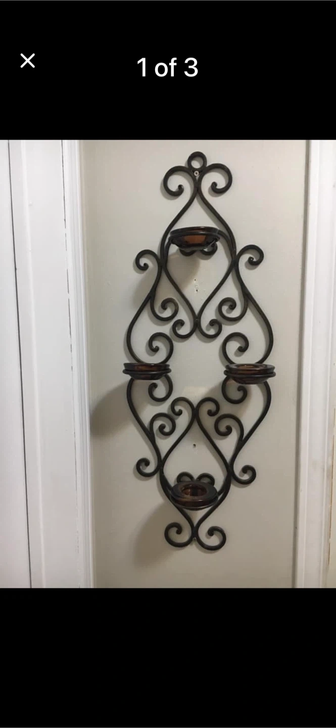 This is a lovely wrought iron candle holder for wall decor. It features an intricate design with spots for five candles. It would be perfect for adding a touch of elegance to any room