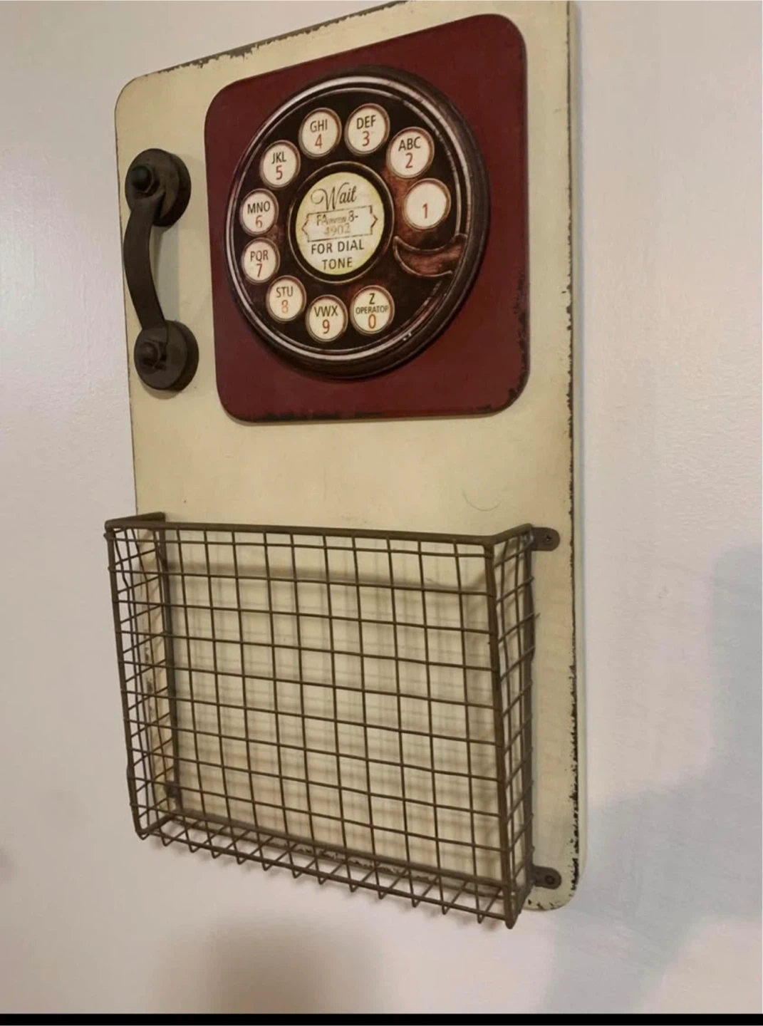 Add a touch of vintage charm to your home with this unique telephone wall organizer! It features a decorative rotary phone design and a wire basket for storing mail, keys, or other small items. Perfect for adding character to your entryway or kitchen