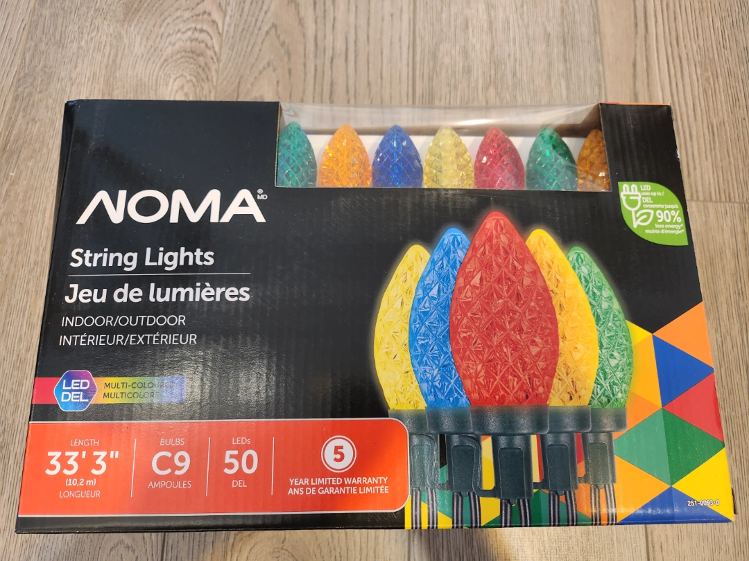 Get ready to brighten up your space with these NOMA String Lights! They're perfect for both indoor and outdoor use. These multi-colour LED lights come in a 33'3" length and feature 50 C9 bulbs. Add a festive touch to any occasion with these energy-saving lights!