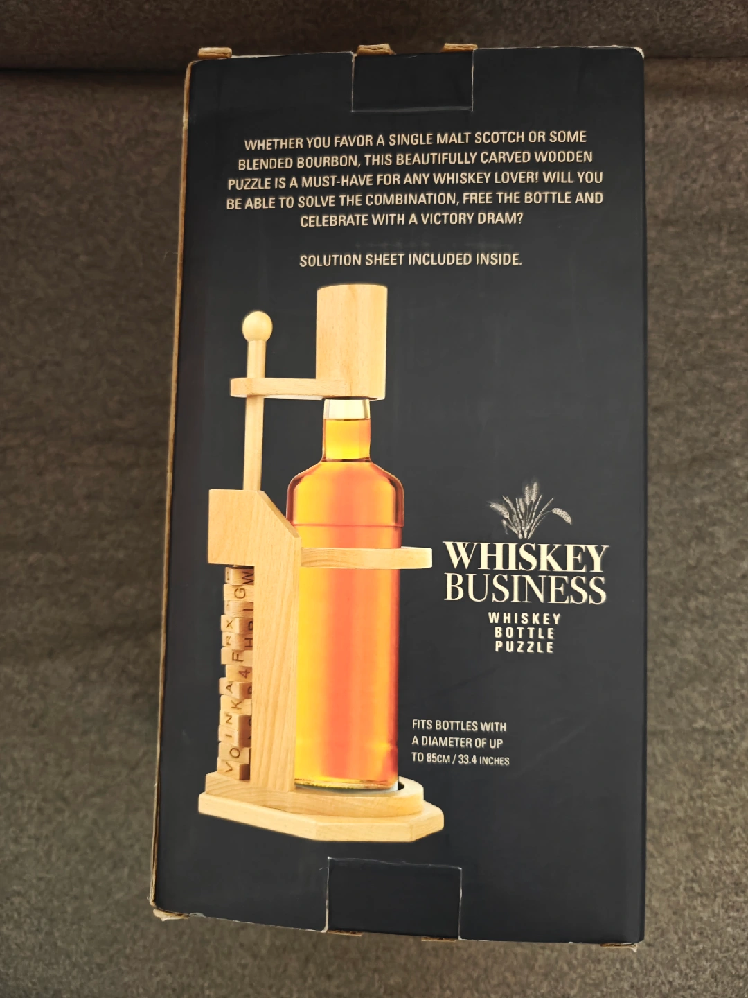 Selling a Whiskey Business Whiskey Bottle Puzzle. This beautifully carved wooden puzzle is a must-have for any whiskey lover! The box states that it fits bottles with a diameter of up to 85cm / 33.4 inches. A solution sheet is included inside