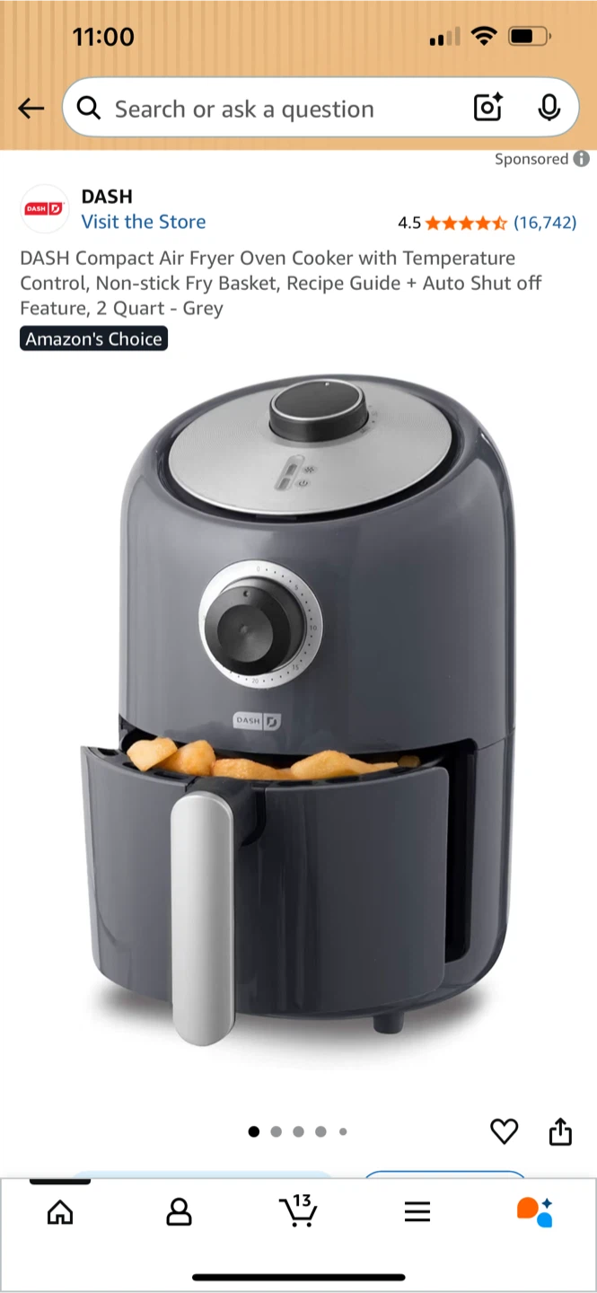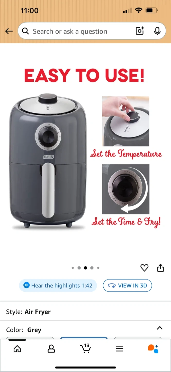 Selling a used DASH compact air fryer in grey. It's in great condition and ready for a new home! It's easy to use, just set the temperature and time, and fry away! Dimensions are approximately 11.4" x 10.2" x 8.1". The brand name slightly rubbed off. Works well, cash only and Pick required.