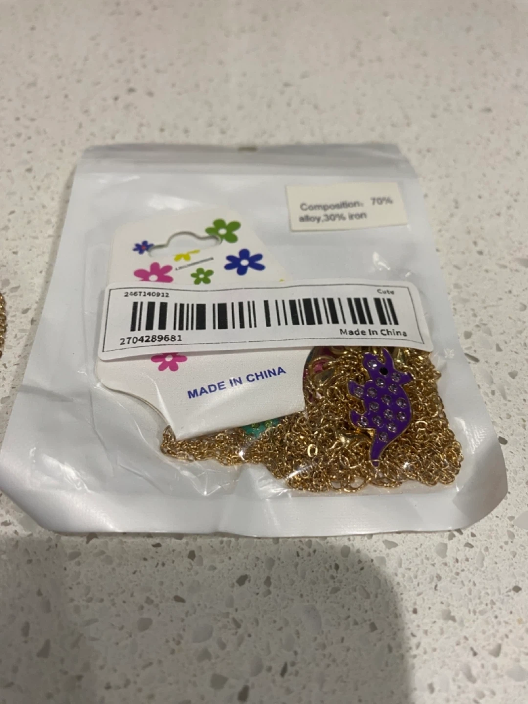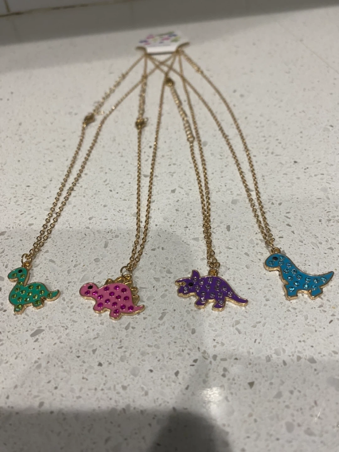 These are four cute dinosaur necklaces! They are gold-coloured with green, pink, purple, and blue dinosaurs as pendants. The composition is 70% alloy and 30% iron
