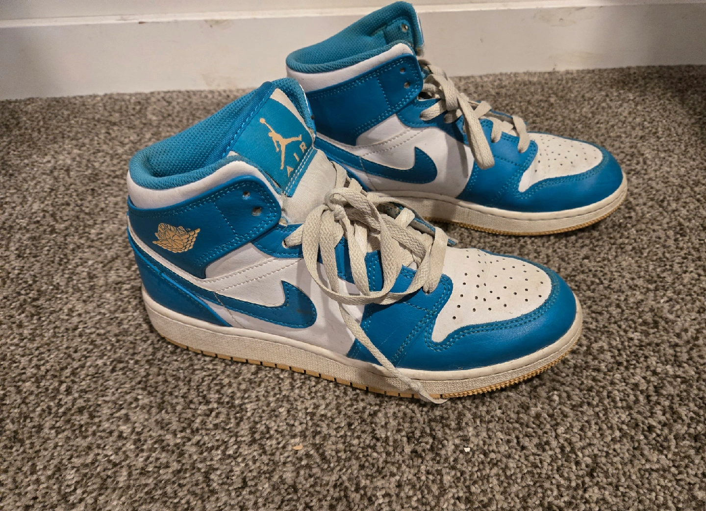 Selling a pair of Air Jordan 1 Mid sneakers in a white and blue colourway.