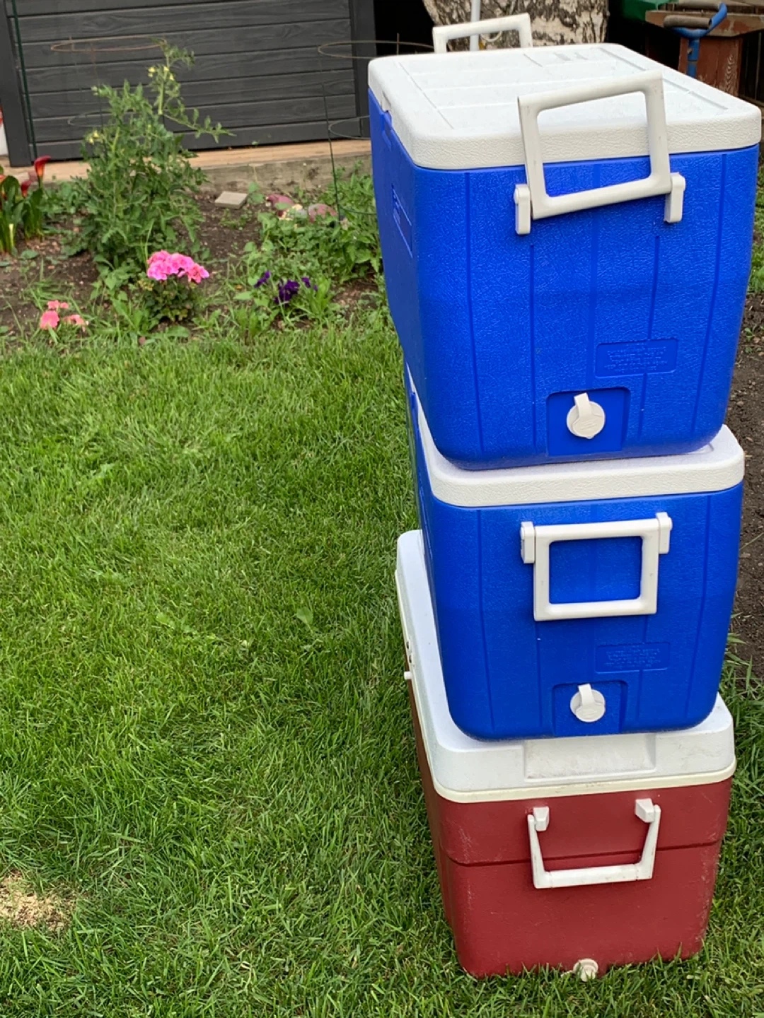 Selling a two coolers, perfect for summer! There's a blue Coleman(48qt / 45.4L), and a red Thermos cooler. They're both in used condition, but still have plenty of life left for picnics, camping, or backyard BBQs