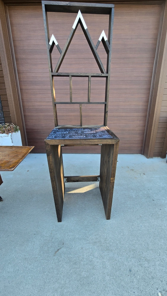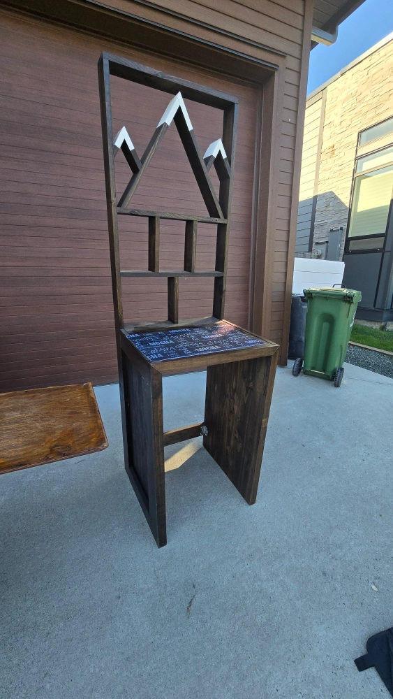 Check out this unique wooden storage unit! It has a cool mountain design on the back. It was custom made to fit a mini fridge and to put a coffee station on top. It is sturdy and would be a great addition to any room