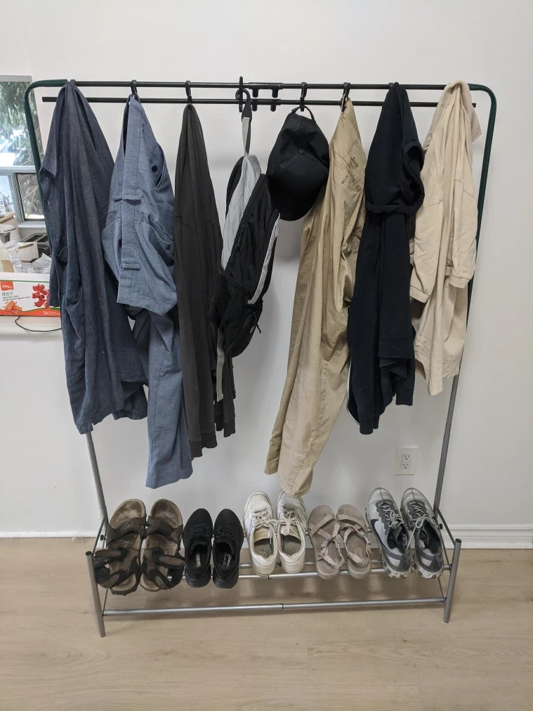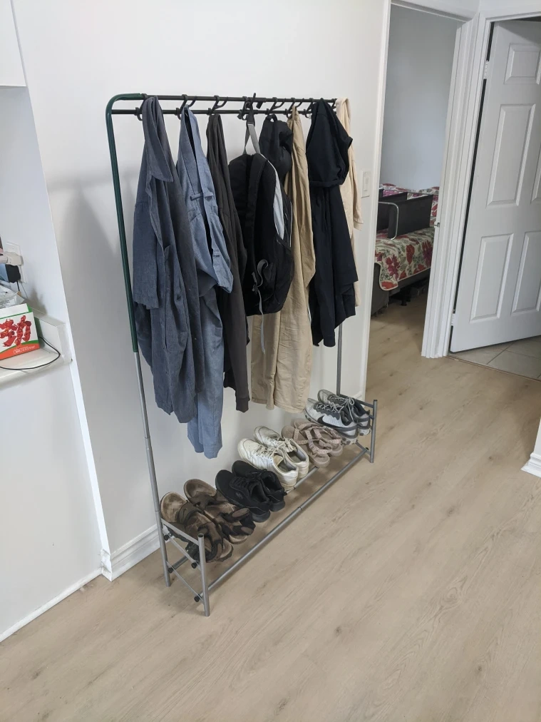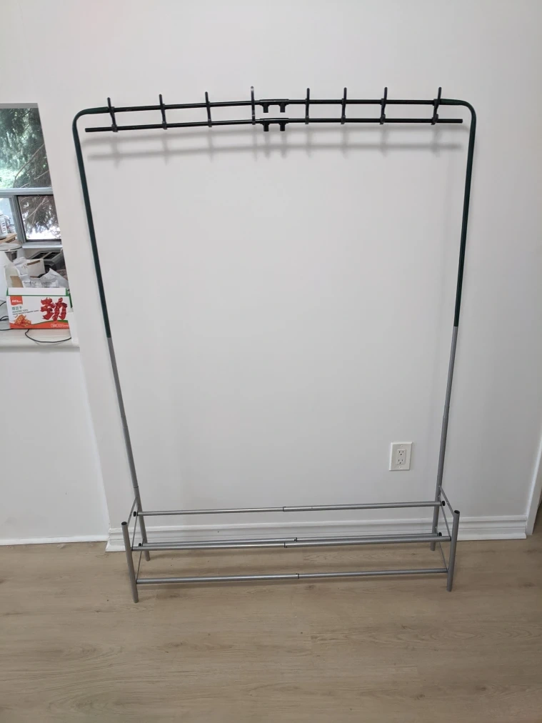 1000+Clothes rack with a built-in shoe storage shelf. It's perfect for organizing your clothes and shoes in a small space. The rack is in great condition and ready for a new home. the size is:46"(w)x9"(d)x65(h) Pick up at 195 Merton Street Toronto or pick up at subway station Davisvill. And I can deliver it to your house but you need to pay me another &3. Thanks.