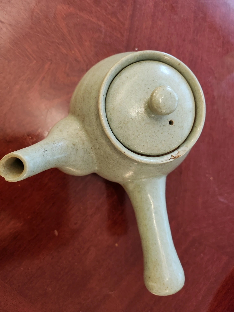 Selling a vintage green ceramic teapot. It has a unique design with a side handle and spout. There's a small chip on the rim, as pictured, but otherwise it's in good condition and ready for a new home!