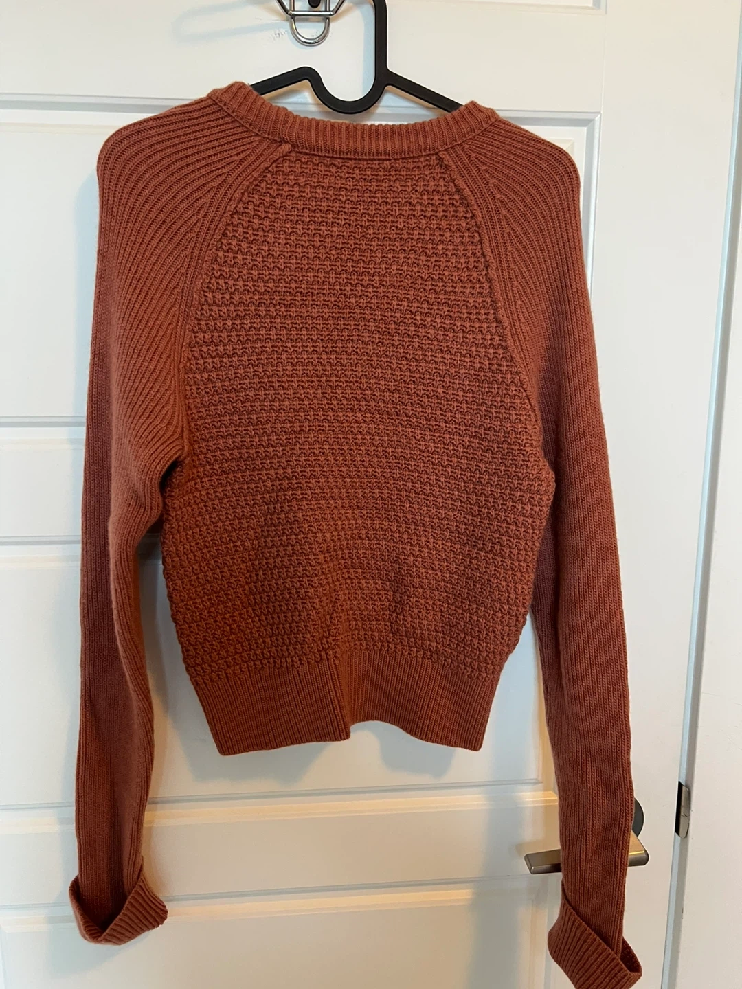 Cozy Club Monaco knit sweater in a lovely terracotta colour! It's a size small and in great condition. Perfect for layering or wearing on its own during cooler weather.