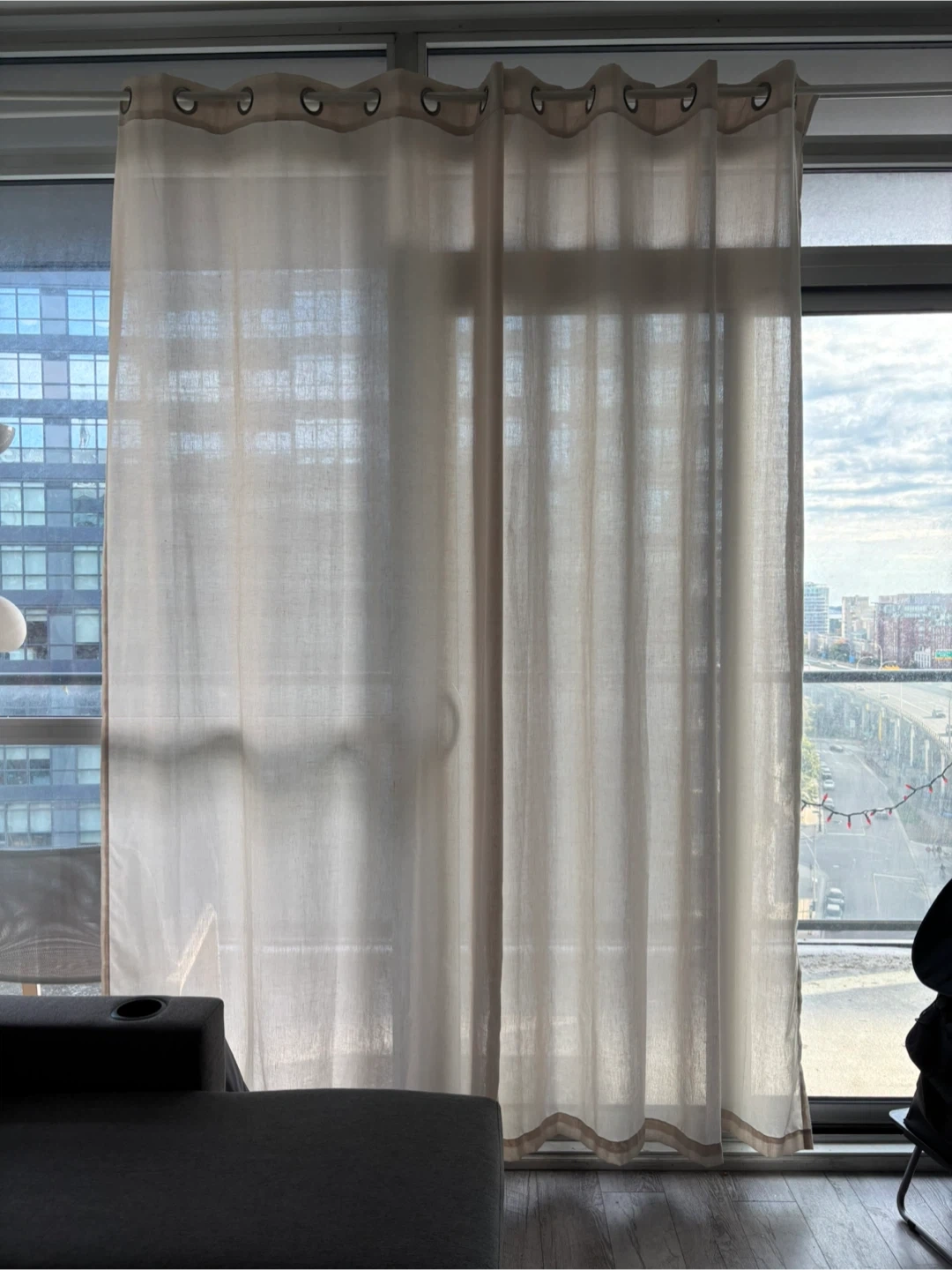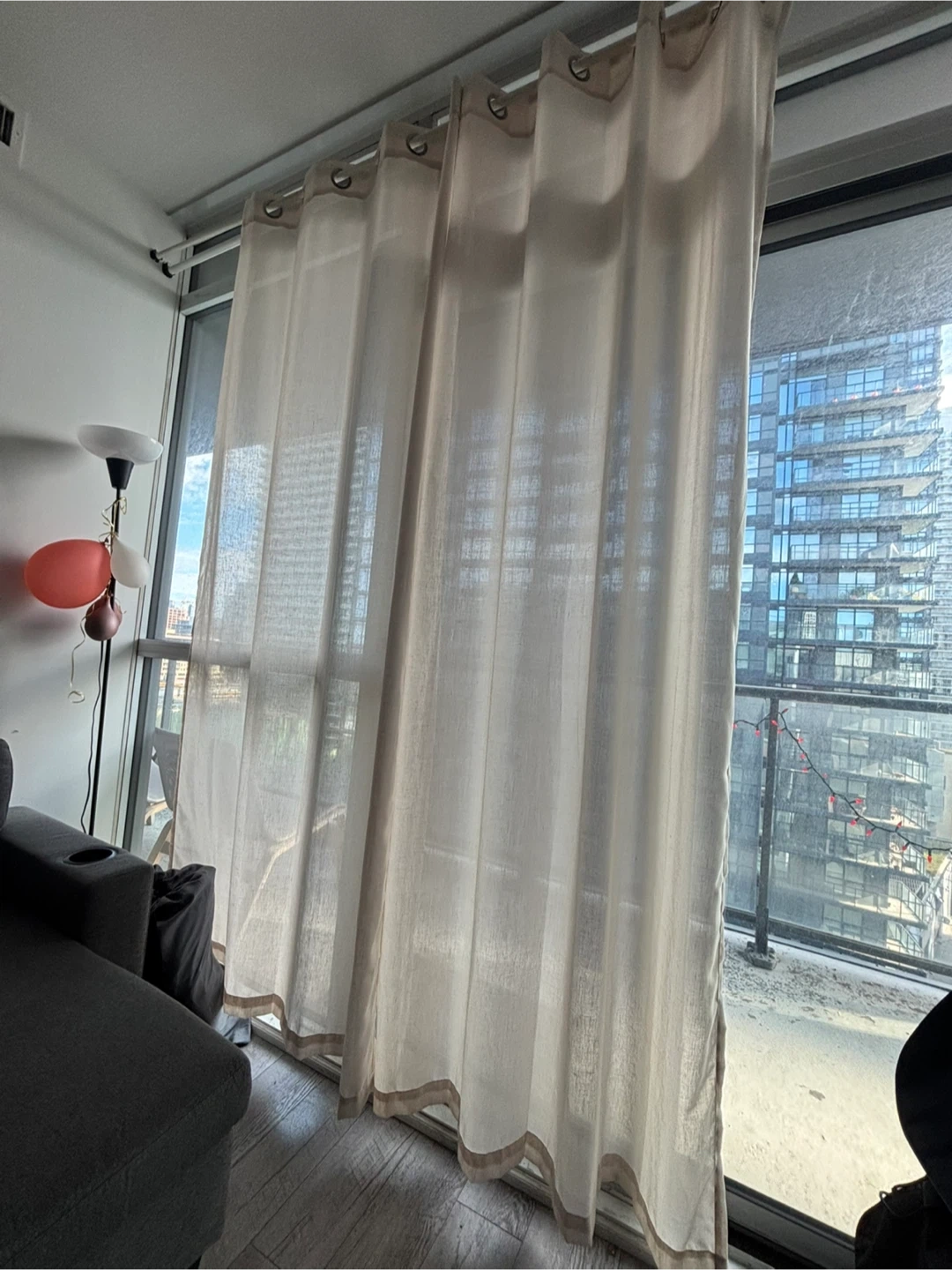 215Natural linen curtains, set of two curtains - 96” long. Perfect for floor to ceiling windows in living room or bedroom. In great condition without any rips or stains, used in a smoke free space. Almost new like condition and do not need extra hoots for installation.