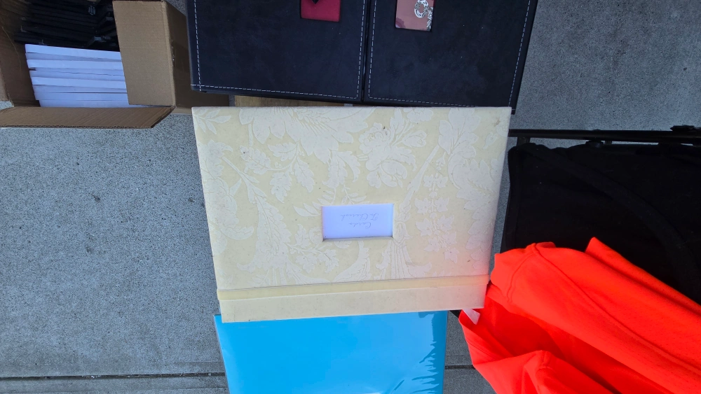 Selling a decorative storage box. It has a floral pattern and a small label that reads 'Cards & Keepsake'. Great for organizing!
