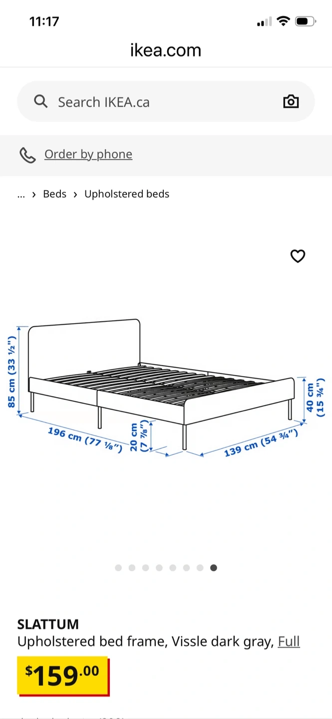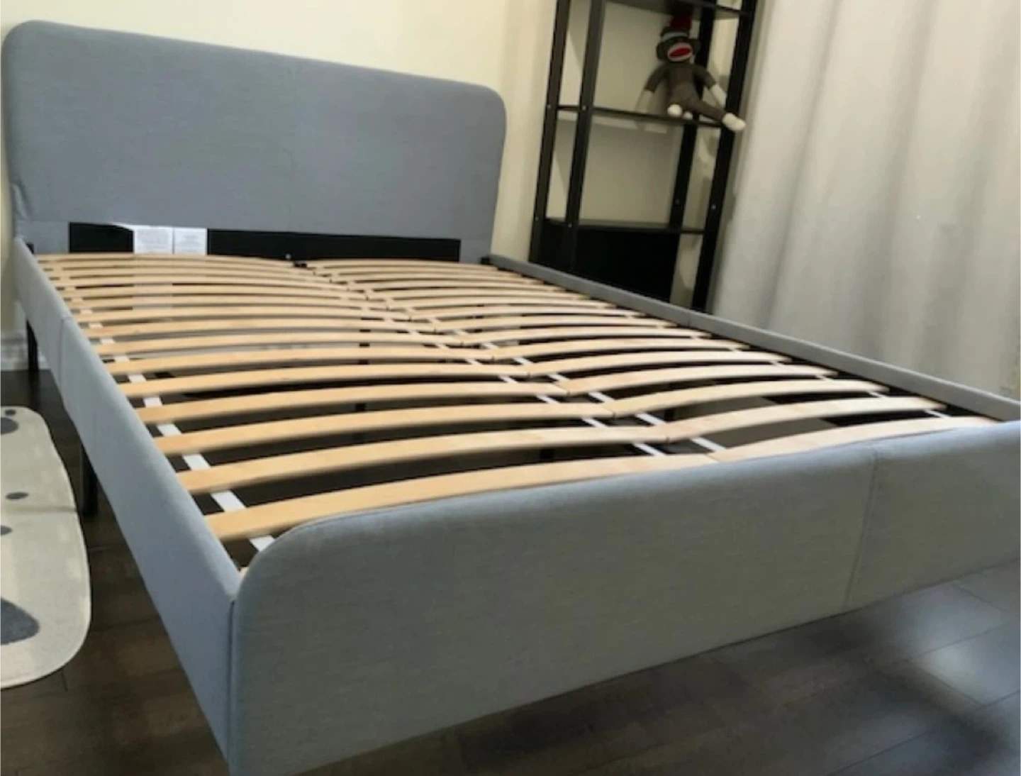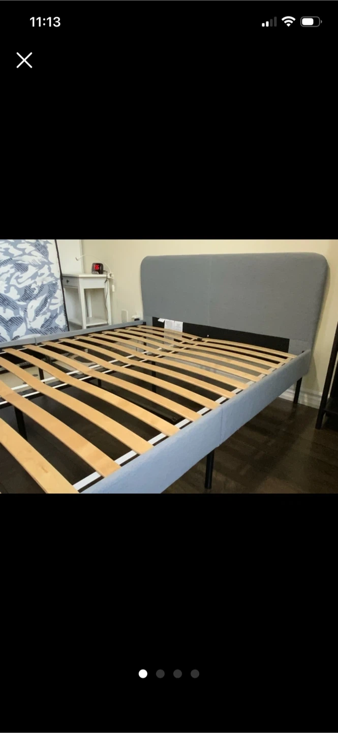 Selling an IKEA SLATTUM upholstered bed frame in Vissle dark gray! It's a full size bed frame. Dimensions are 196 cm (77 1/4") long and 139 cm (54 3/4") wide. The headboard is 85 cm (33 1/2") tall. Originally bought for $159