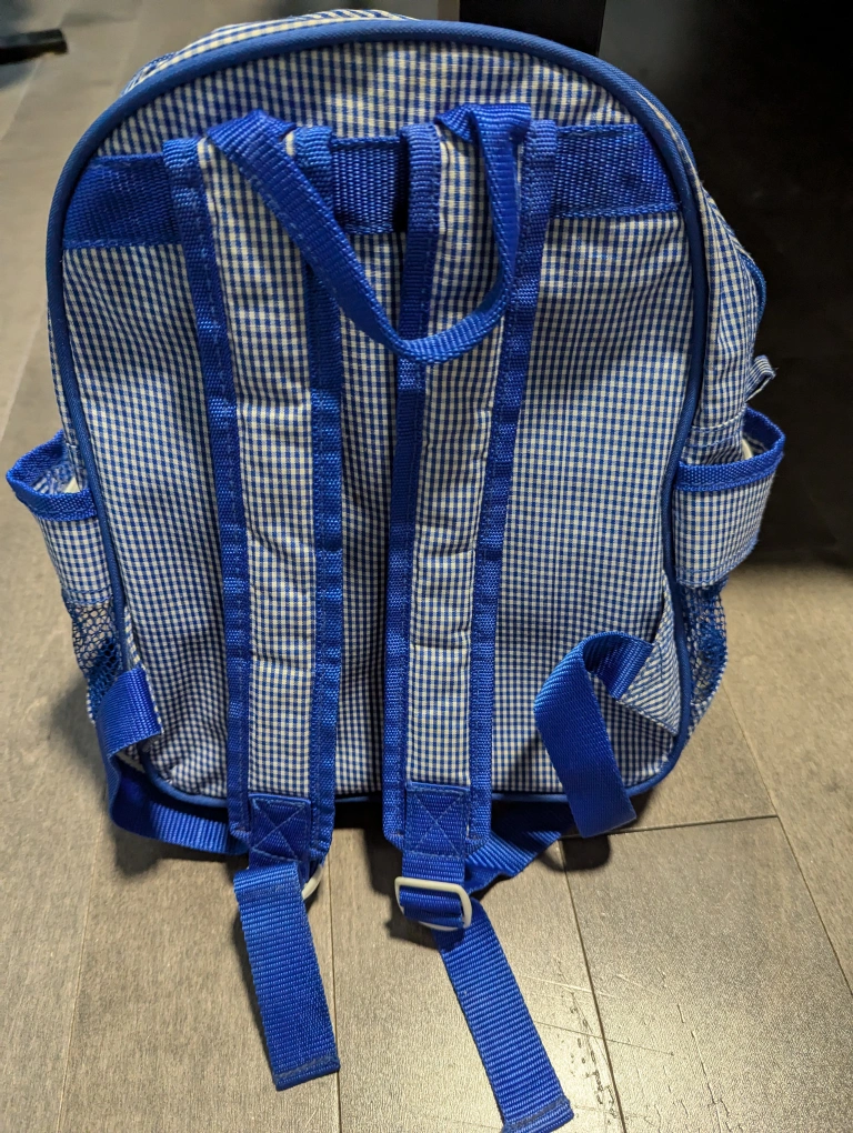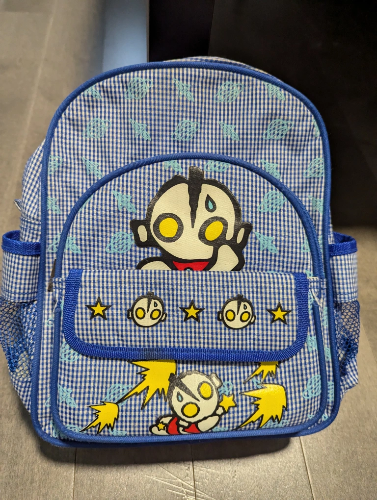 A cute Ultraman backpack for kids! It features a blue and white checkered pattern with Ultraman character designs. Perfect for school or outings!