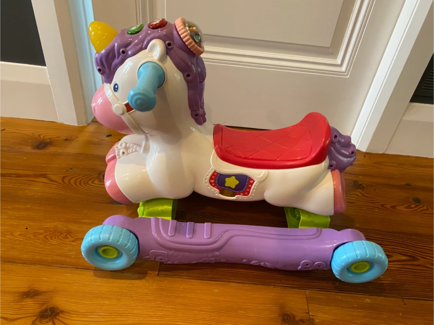 This is a VTech Rock & Ride Unicorn. It's in great shape and ready for a new home! It features a red seat, purple mane, and colourful accents. Perfect for toddlers who love to rock and play