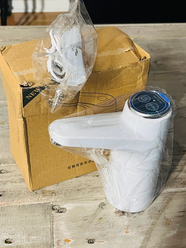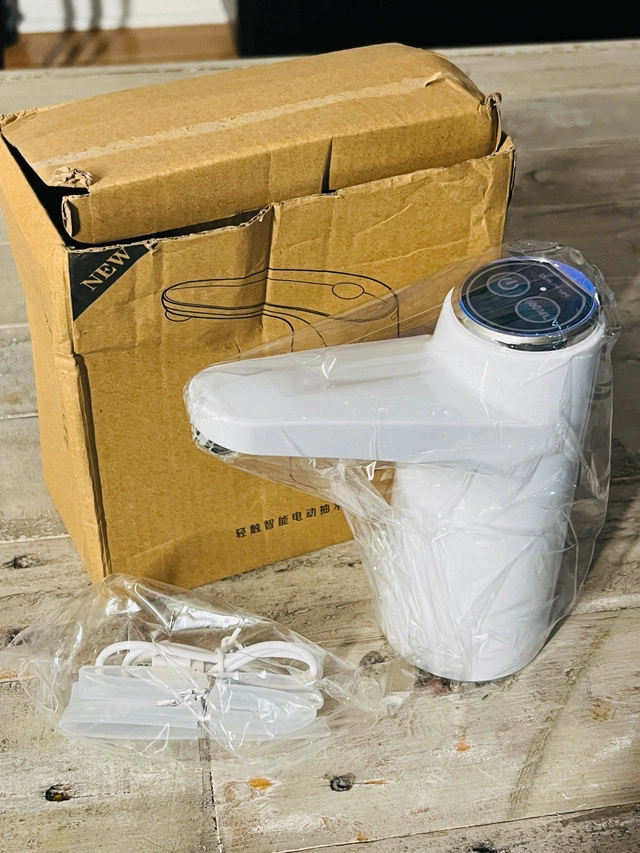 This is a new automatic water dispenser pump, perfect for dispensing water easily from standard water bottles. It features a simple on/off button and provides a convenient way to get water without lifting heavy bottles. Pick up is available in Brampton near Sheridan College.