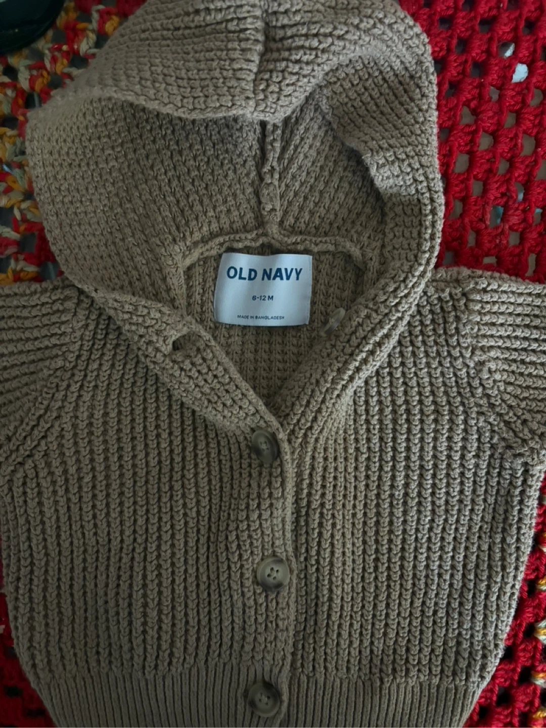 Super cute Old Navy baby hoodie, perfect for keeping your little one cozy! It's in great condition and sized for 6-12 months. The neutral colour goes with everything too