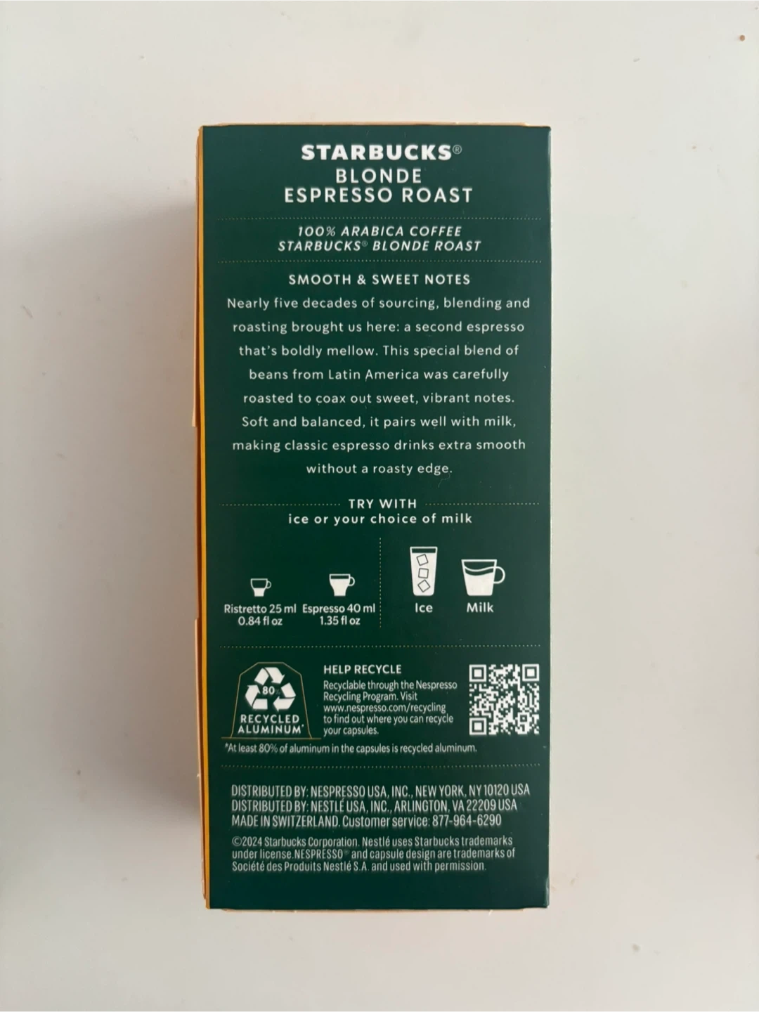Selling three boxes of Starbucks Blonde Espresso Roast Nespresso pods. Each box contains 10 aluminum capsules of ground coffee, net weight 1.86 oz (53g). These are for original Nespresso machines. Smooth & sweet notes, intensity 6. Expires 2026